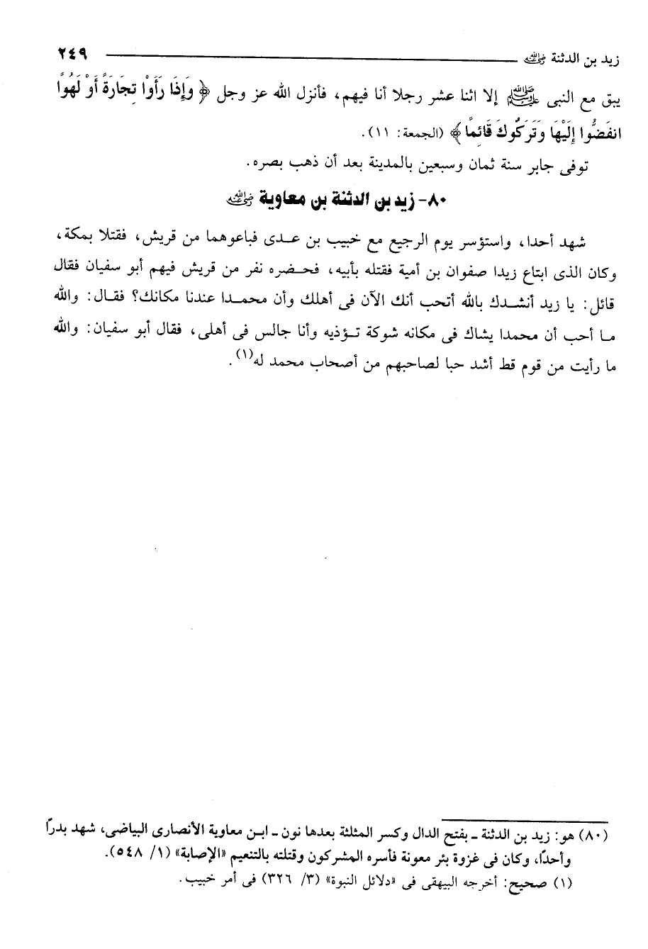80- هو: زيد بن الدثنة بفتح الدال وكسر المثلثة بعدها نون ابن معاوية الأنصاري البياضي شهد بدرا وأحدا وكان في غزوة بئر معونة فأسره المشركون وقتلته بالتنعيم الإصابة 1/548.