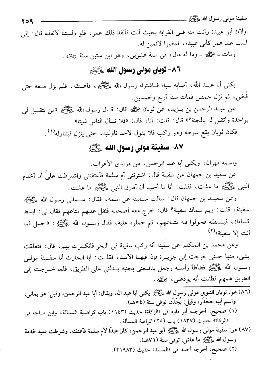 87- هو: سفينة مولى رسول الله صلى الله عليه وسلم أبو عبد الرحمن كان عبدا لأم سلمة فأعتقته وشرطت عليه خدمة رسول الله صلى الله عليه وسلم ما عاش توفي سنة 71هـ.