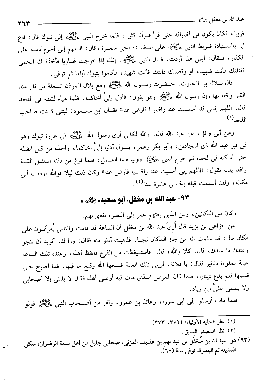93- هو: عبد الله بن مغفل بن عبد نهم بن عفيف المزني صحابي جليل من أهل بيعة الرضوان سكن المدينة ثم البصرة توفي سنة 60.
