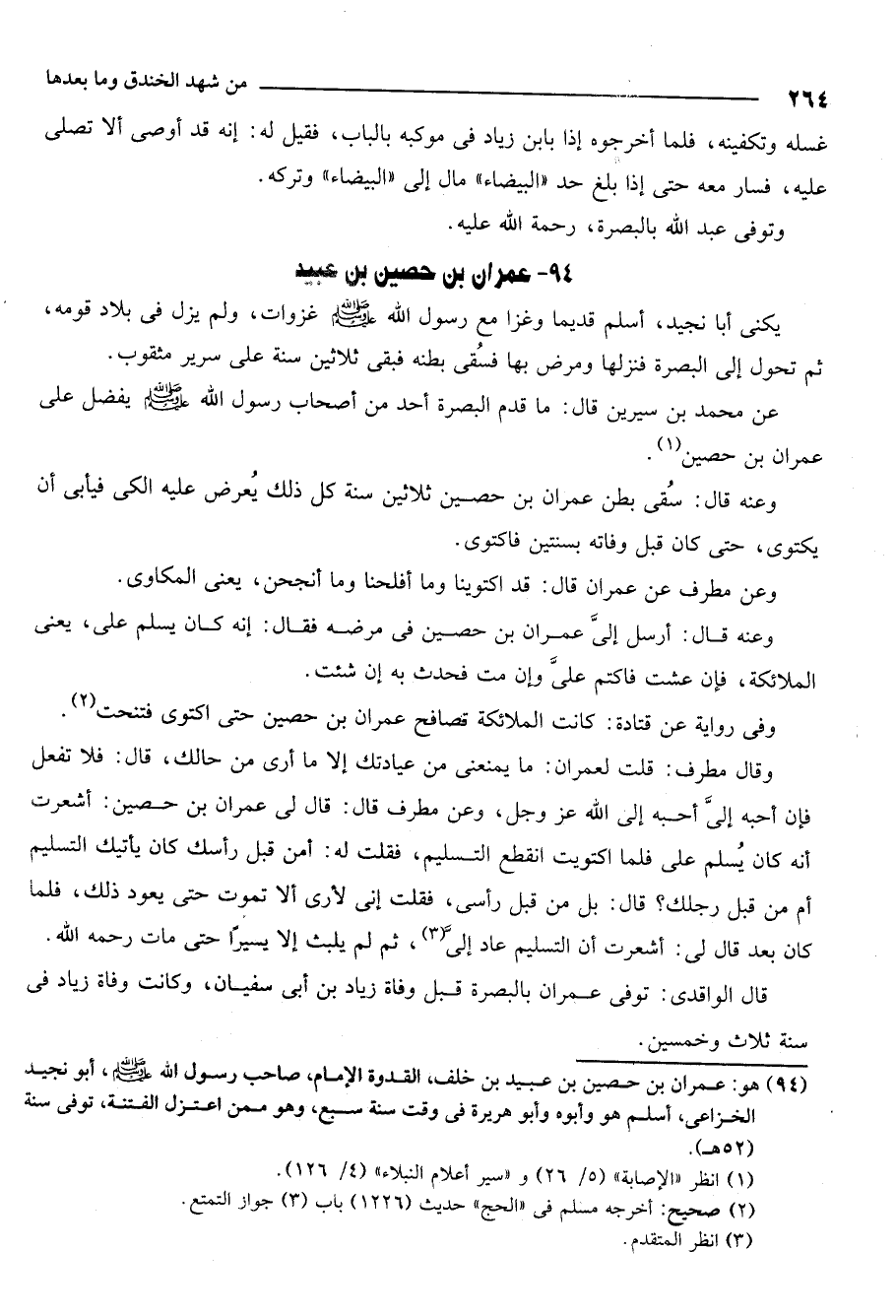 94- هو: عمران بن حصين بن عبيد بن خلف القدوة الإمام صاحب رسول الله صلى الله عليه وسلم أبو نجيد الخزاعي أسلم هو وأبوه وأبو هريرة في وقت سنة سبع وهو ممن اعتزل الفتنة توفي سنة 52هـ.