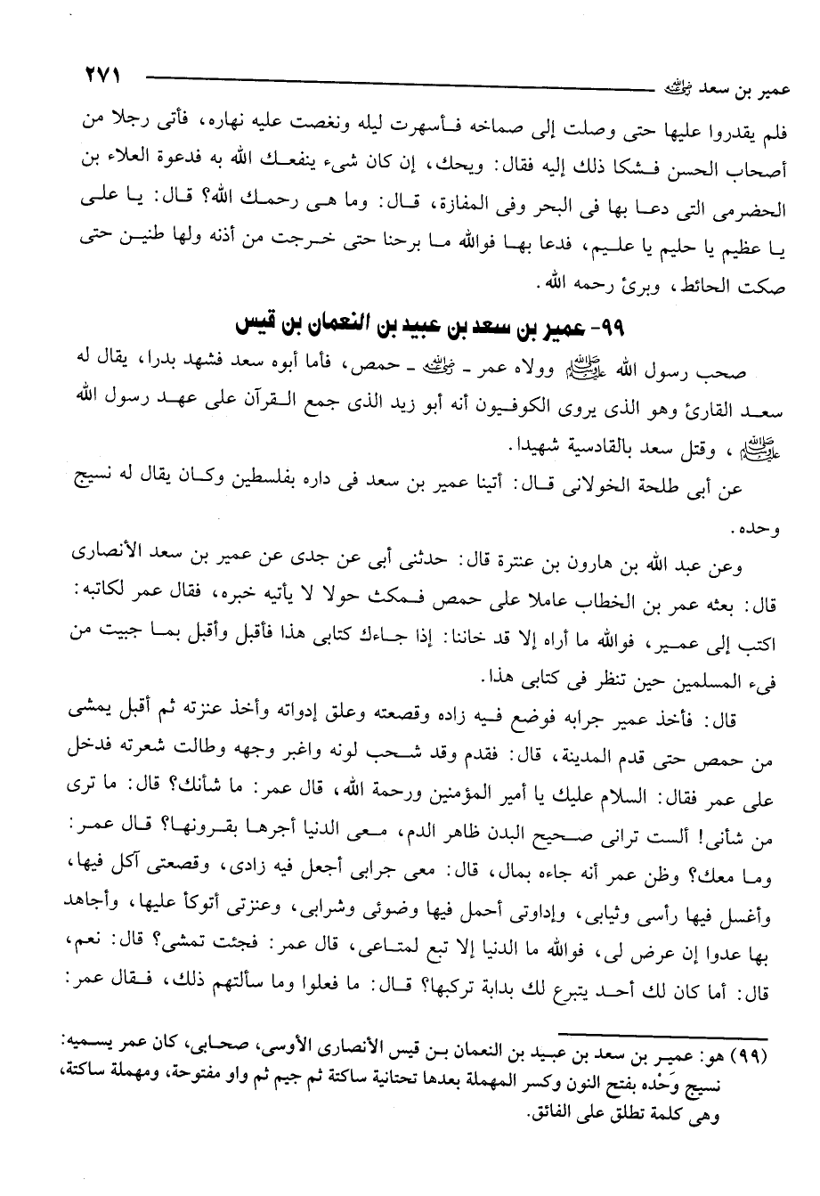 99- هو: عمير بن سعد بن عبيد بن النعمان بن قيس الأنصاري الأوسي صحابي كان عمر يسميه: نسيج وحده بفتح النون وكسر المهملة بعدها تحتانية ساكنة ثم جيم ثم واو مفتوحة ومهملة ساكنة وهي كلمة تطلق على الفائق.