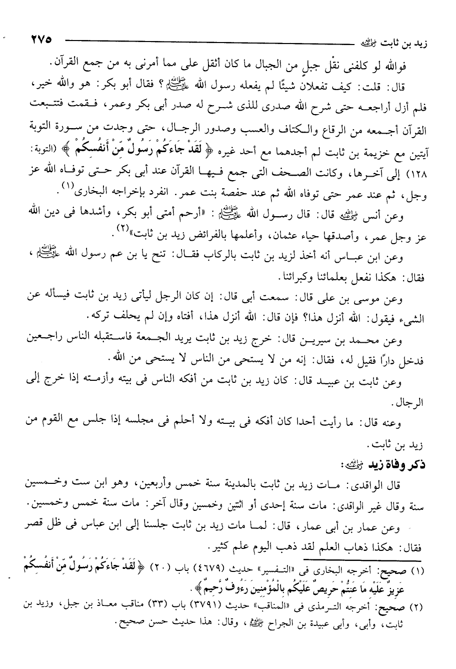 قال قلت كيف تفعلان شيئا لم يفعله رسول الله. صلى الله عليه وسلم فقال أبو بكر هو الله خير فلم ازل اراجعه حتى شرح الله صدري للذي شرح له صدر أبي بكر وعمر. فقمت فتتبعت القرآن اجمعه من الرقاع والاكتاف والعسب وصدور الرجال حتى وجدت من سورة التوبة ايتين مع خزيمة بن ثابت لم أجدهما مع أحد غيره: {لَقَدْ جَاءَكُمْ رَسُولٌ مِنْ أَنْفُسِكُمْ} [التوبة: 128] إلى اخرها وكانت الصحف التي جمع فيها القرآن عند أبي بكر حتى توفاه الله عز وجل ثم عند عمر حتى توفاه الله ثم عند حفصة بنت عمر انفرد باخراجه البخاري1.