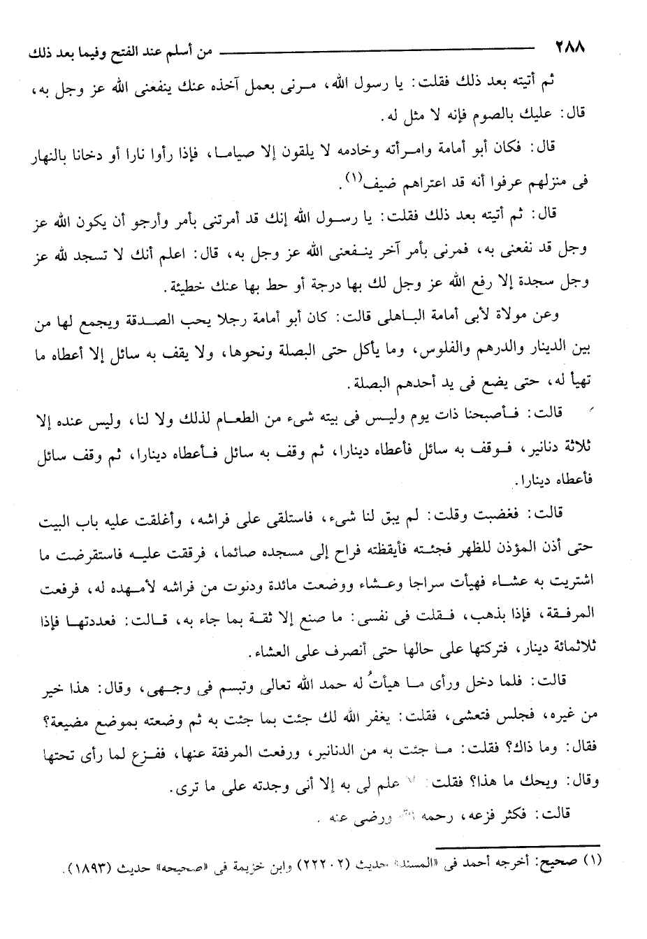 قالت فاصبحنا ذات يوم وليس في بيته شيء من الطعام لذلك ولا لنا وليس عنده إلا ثلاثة دنانير فوقف به سائل فاعطاه دينارا ثم وقف به سائل فاعطاه دينارا ثم وقف سائل فاعطاه دينارا.