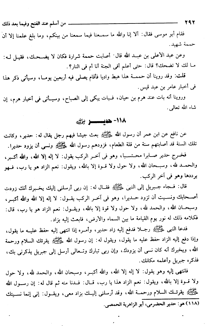 قال فجاء جبريل إلى النبي صلى الله عليه وسلم فقال له ان ربي ارسلني اليك يخبرك انك زودت اصحابك ونسيت ان تزود حديرا وهو في آخر الركب يقول لا اله إلا الله والله اكبر وسبحان الله والحمد لله ولا حول ولا قوة إلا بالله ويقول نعم الزاد هو يا رب قال فكلامه ذلك له نور يوم القيامة ما بين السماء والأرض فابعث إليه بزاد.