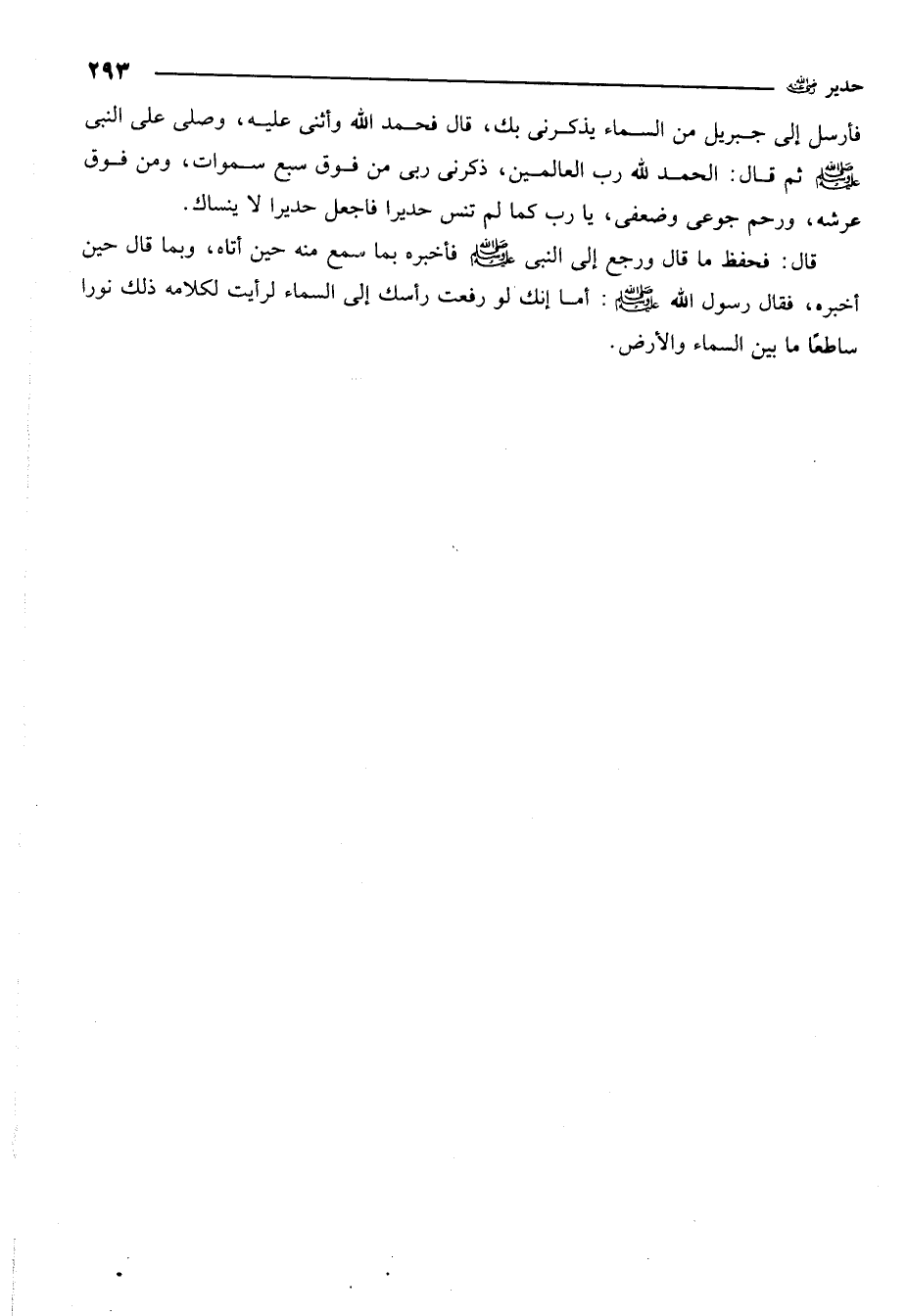 فارسل إلي جبريل من السماء يذكرني بك قال فحمد الله واثنى عليه وصلى على النبي صلى الله عليه وسلم ثم قال الحمد لله رب العالمين ذكرني ربي من فوق سبع سموات ومن فوق عرشه ورحم جوعي وضعفي يا رب كما لم تنس حديرا فاجعل حديرا لا ينساك. قال فحفظ ما قال ورجع إلى النبي صلى الله عليه وسلم فأخبره بما سمع منه حين أتاه وبما قال حين أخبره فقال رسول الله صلى الله عليه وسلم: "أما انك لو رفعت رأسك إلى السماء لرأيت لكلامه ذلك نورا ساطعا ما بين السماء والأرض".