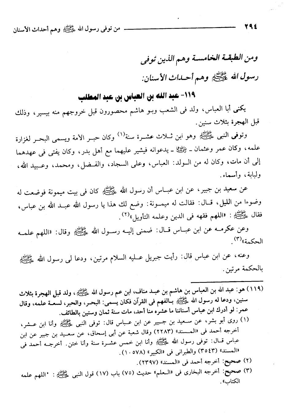 119- هو: عبد الله بن العباس بن هاشم بن عبد مناف ابن عم رسول الله صلى الله عليه وسلم ولد قبل الهجرة بثلاث سنين ودعا له رسول الله صلى الله عليه وسلم بالفهم في القرآن فكان يسمى البحر والحبر لسعة علمه وقال عمر: لو أدرك ابن عباس اسناننا ما عشره منا أحد مات سنة ثمان وستين بالطائف.