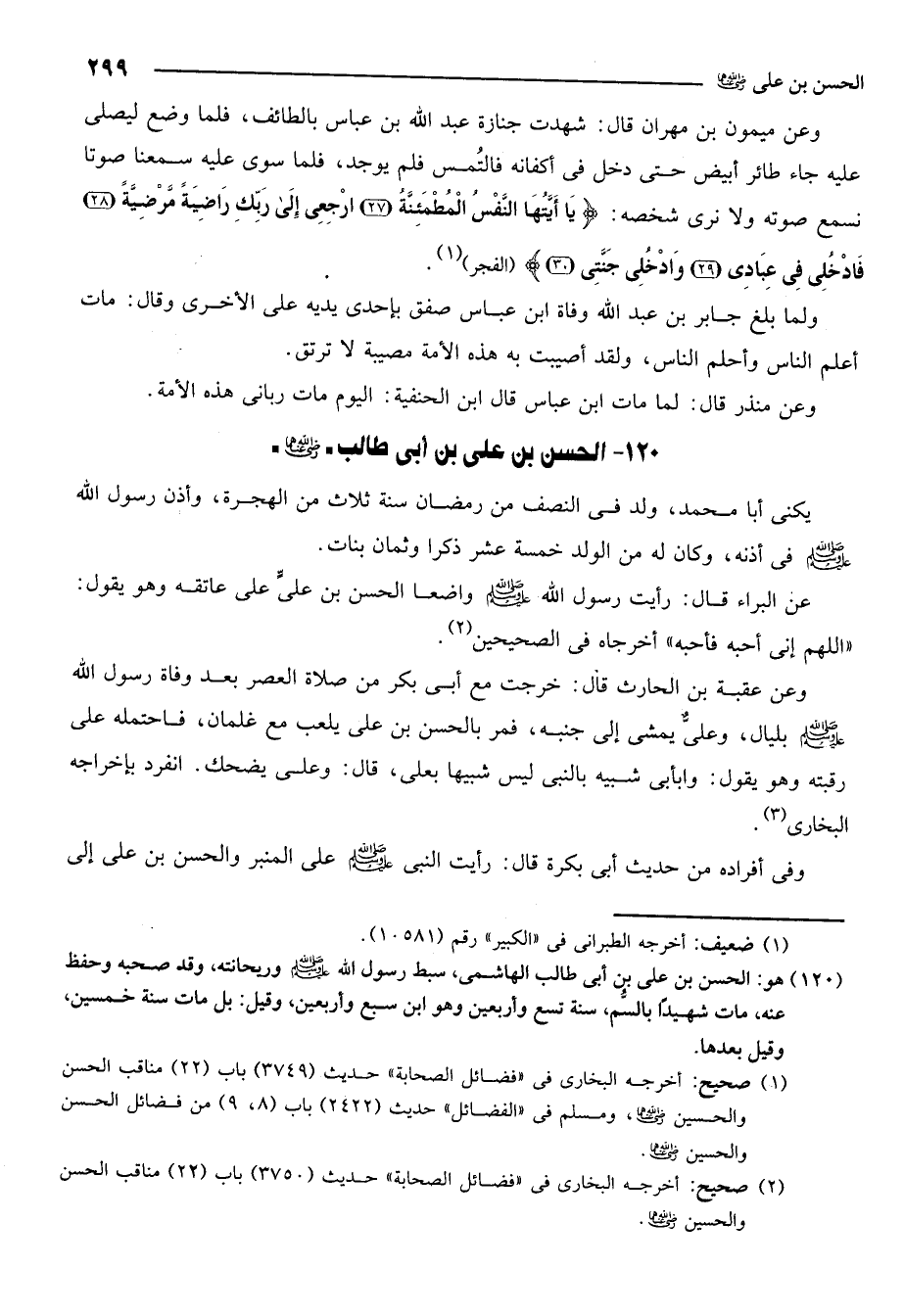 120- هو: الحسن بن علي بن أبي طالب الهاشمي سبط رسول الله صلى الله عليه وسلم وريحانته وقد صحبه وحفظ عنه مات شهيدا بالسم سنة تسع وأربعين وهو ابن سبع وأربعين وقيل: بل مات سنة خمسين وقيل بعدها.