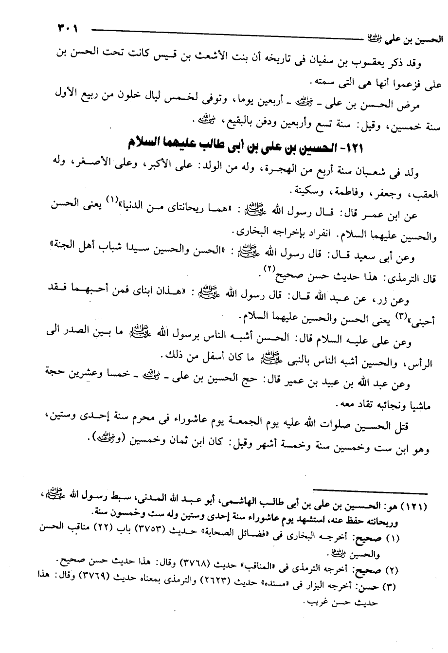 121- هو: الحسين بن علي بن أبي طالب الهاشمي أبو عبد الله المدني سبط رسول الله صلى الله عليه وسلم وريحانته حفظ عنه استشهد يوم عاشوراء سنة إحدى وستين وله ست وخمسون سنة.