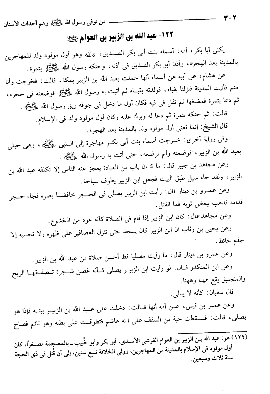 122- هو: عبد الله بن الزبير بن العوام القرشي الأسدي أبو بكر وأبو خبيب بالمعجمة مصغرا كان أول مولود في الإسلام بالمدينة من المهاجرين وولي الخلافة تسع سنين إلى أن قتل في ذي الحجة سنة ثلاث وسبعين.