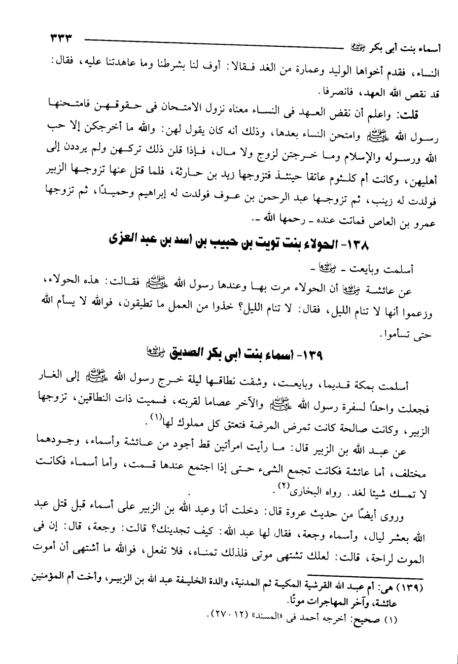 139- هي: أم عبد الله القرشية المكية ثم المدنية والدة الخليفة عبد الله بن الزبير وأخت أم المؤمنين عائشة وآخر المهاجرات موتا.