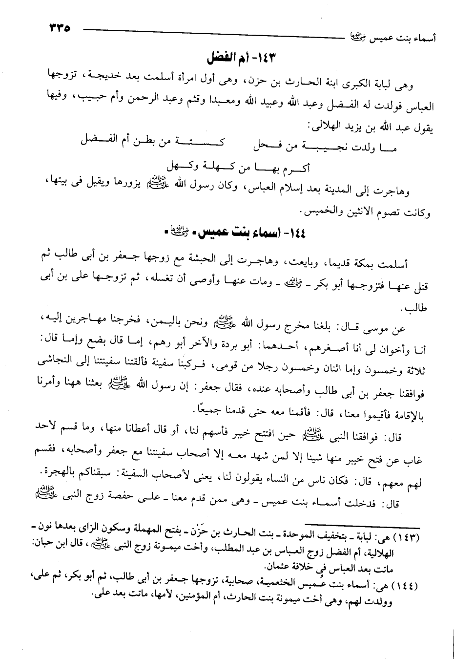 144- هي: أسماء بنت عميس الخثعمية صحابية تزوجها جعفر بن أبي طالب ثم ابو بكر ثم علي وولدت لهم وهي أخت ميمونة بنت الحارث أم المؤمنين لأمها ماتت بعد علي.