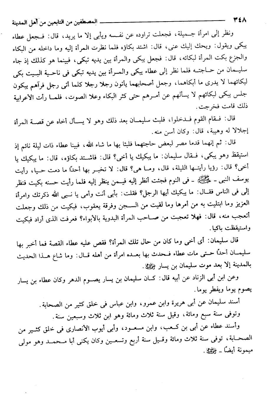 قال ثم إنهما قدما مصر لبعض حاجتهما فلبثا بها ما شاء الله فبينا عطاء ذات ليلة نائم إذ استيقظ وهو يبكيزز فقال سليمان: مايبكيك يا أخي؟ قال: فاشتد بكاؤه. قال: ما يبكيك يا أخي؟ قال: رؤيا رأيتها الليلة. قال، وما هي؟ قال لا تخبر بها أحداً ما دمتُ حياً: رأيت يوسف النبي صلى الله عليه وسلم في النوم فجئت أنظر إليه فيمن ينظر إليه فلما رأيت حسنه بكيت فنظر إليّ في الناس فقال: ما يبكيك أيها الرجل؟ فقلت: بأبي أنت وأمي يا نبي الله، ذكرتك وامرأة العزيز وما اُبتليتَ به من أمرها وما لقيتَ من السجن وفرقة يعقوب، فبكيت من ذلك وجعلت أتعجّب منه. قال: فهلا تعجّبت من صاحب المرأة البدوية بالأبواء؟ فعرفت الذي أراد فبكيت واستيقظت باكياً.