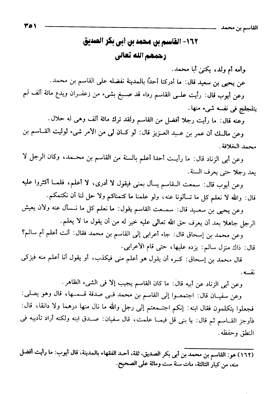 162- هو: القاسم بن محمد بن أبي بكر الصديق ثقة أحد الفقهاء بالمدينة قال أيوب ما رايت أفضل منه من كبار الثالثة مات سنة ست ومائة على الصحيح.