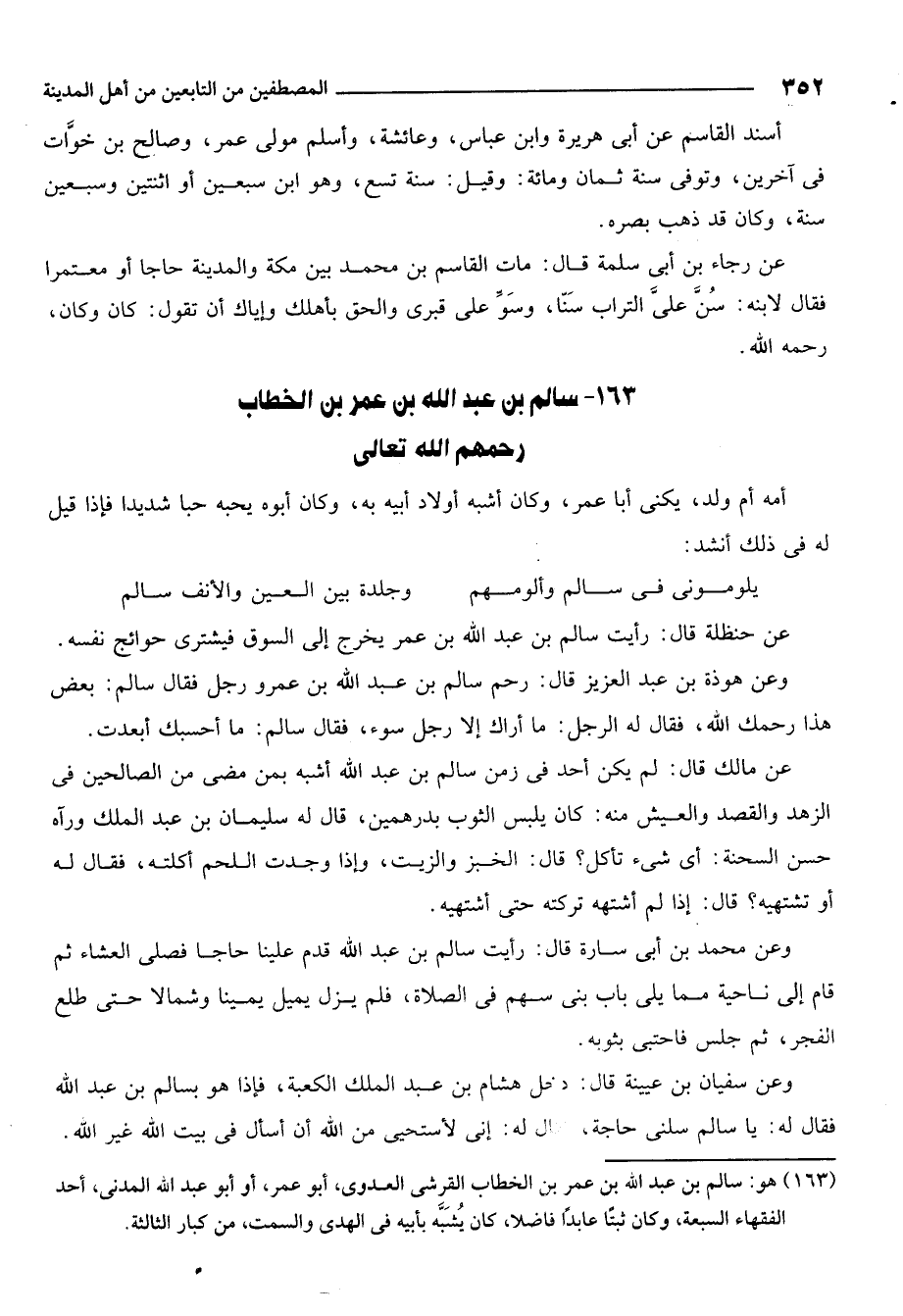 163- هو: سالم بن عبد الله بن عمر بن الخطاب القرشي العدوي أبو عمر أو أبو عبد الله المدني أحد الفقهاء السبعة وكان ثبتا عابدا فاضلا كان يشبه بأبيه في الهدى والسمت من كبار الثالثة.