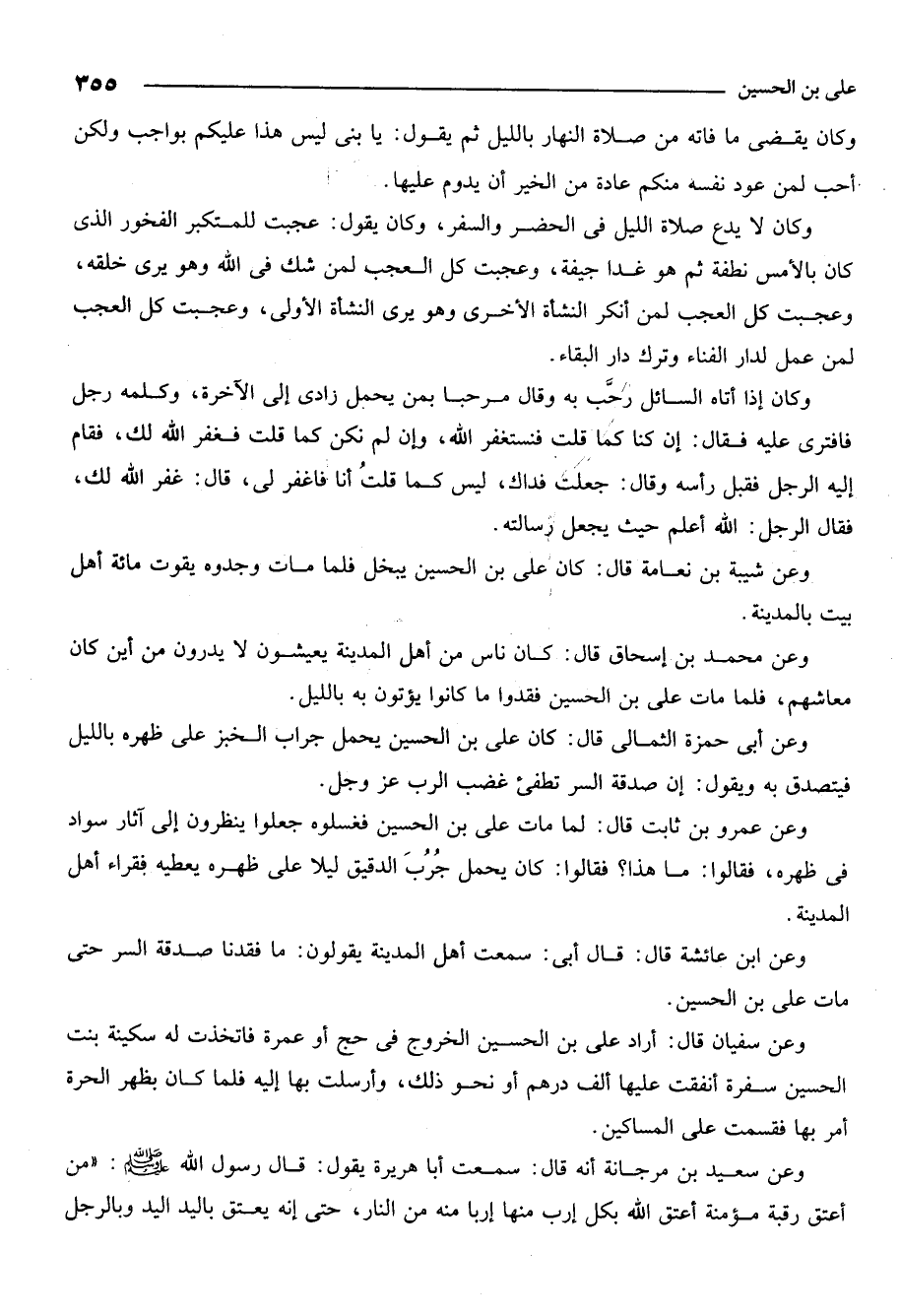 وعن عمرو بن ثابت قال: لما مات علي بن الحسين فغسلوه جعلوا ينظرون إلى آثار سود في ظهره، فقالوا: ما هذا؟ فقالوا: كان يحمل جرب الدقيق ليلاً على ظهره يعطيه فقراء أهل المدينة.