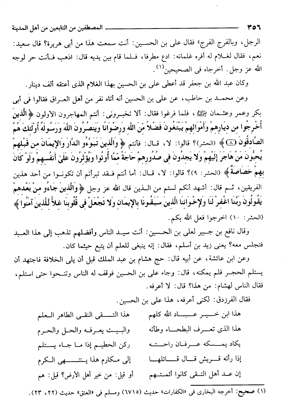 وعن محمد بن حاطب، عن علي بن الحسين أنه أتاه نفر من أهل العراق فقالوا في أبي بكر وعمر وعثمان رضي الله عنهم. فلما فرغوا فقال ألا تخبروني: أنتم المهاجرون الأوّلون {الَّذِينَ أُخْرِجُوا مِنْ دِيَارِهِمْ وَأَمْوَالِهِمْ يَبْتَغُونَ فَضْلاً مِنَ اللَّهِ وَرِضْوَاناً وَيَنْصُرُونَ اللَّهَ وَرَسُولَهُ أُولَئِكَ هُمُ الصَّادِقُونَ} [الحشر: 8] قالوا: لا قال فأنتم {وَالَّذِينَ تَبَوَّأُوا الدَّارَ وَالْأِيمَانَ مِنْ قَبْلِهِمْ يُحِبُّونَ مَنْ هَاجَرَ إِلَيْهِمْ وَلا يَجِدُونَ فِي صُدُورِهِمْ حَاجَةً مِمَّا أُوتُوا وَيُؤْثِرُونَ عَلَى أَنْفُسِهِمْ وَلَوْ كَانَ بِهِمْ خَصَاصَةٌ} [الحشر: 9] قالوا. لا قال: أما أنتم فقد تبرأتم أن تكونوا من أحد هذين الفريقين. ثم قال: أشهد أنكم لستم من الذين قال الله عز وجل {وَالَّذِينَ جَاءُوا مِنْ بَعْدِهِمْ يَقُولُونَ رَبَّنَا اغْفِرْ لَنَا وَلِإِخْوَانِنَا الَّذِينَ سَبَقُونَا بِالْأِيمَانِ وَلا تَجْعَلْ فِي قُلُوبِنَا غِلّاً لِلَّذِينَ آمَنُوا} [الحشر: 10] أخرجوا فعل الله بكم.