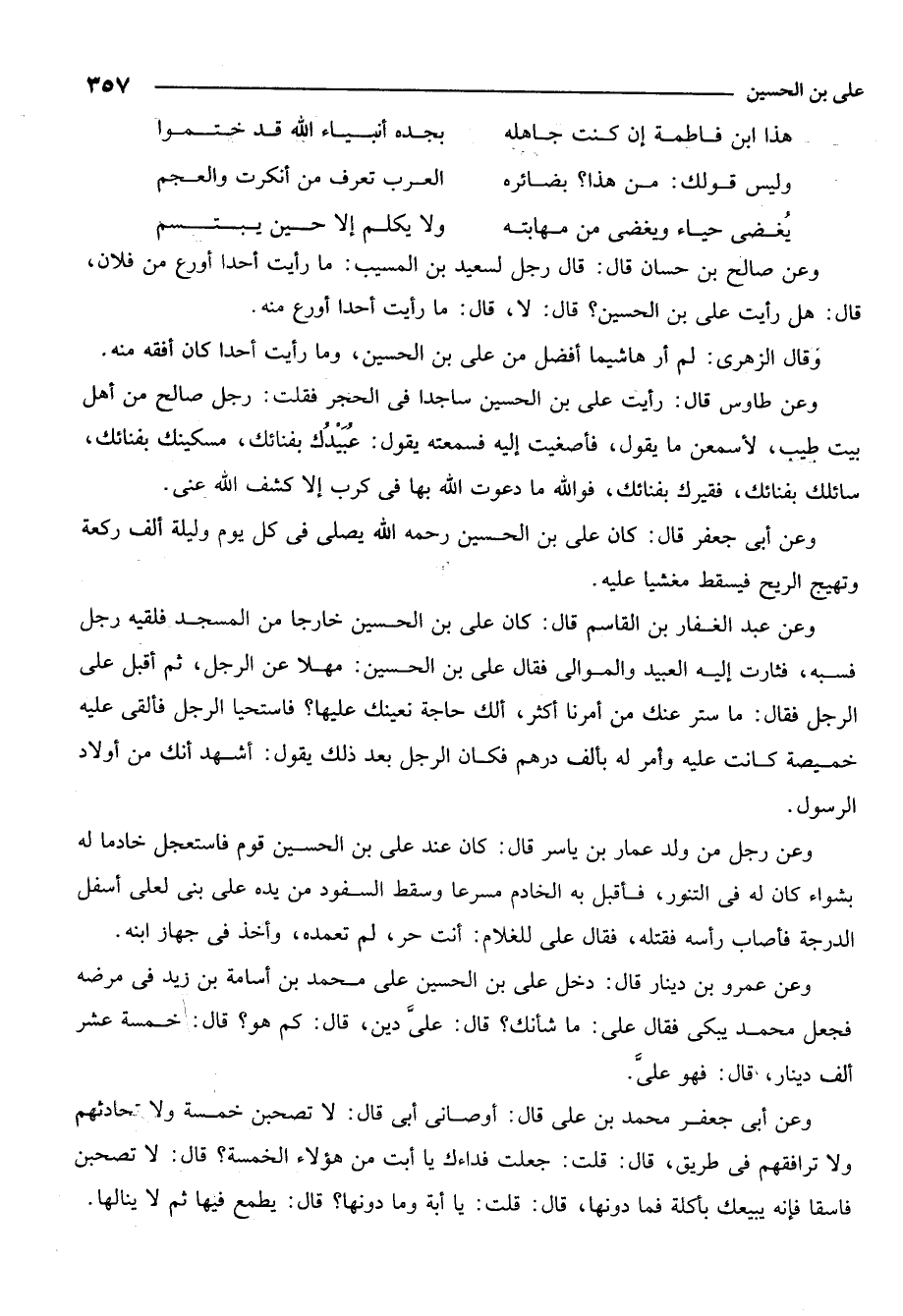 وعن أبي جعفر قال: كان علي بن الحسين رحمه الله يصلي في كل يوم وليلة ألف ركعةٍ وتهيج الريح فيسقط مغشياً عليه.