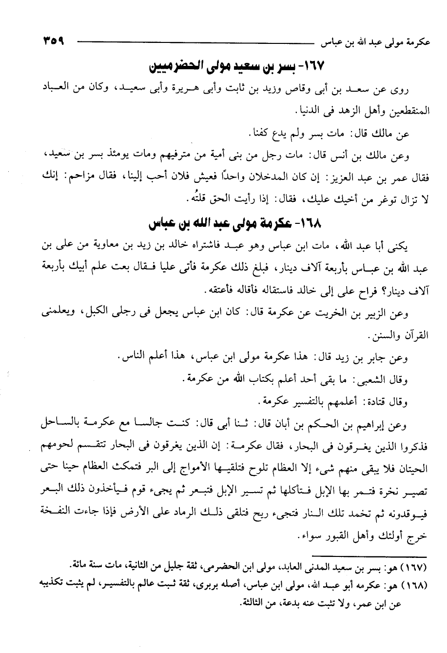 168- هو: عكرمة أبو عبد الله مولى ابن عباس أصله بربري ثقة ثبت عالم بالتفسير لم يثبت تكذيبه عن ابن عمر ولا تثبت عنه بدعة من الثالثة.