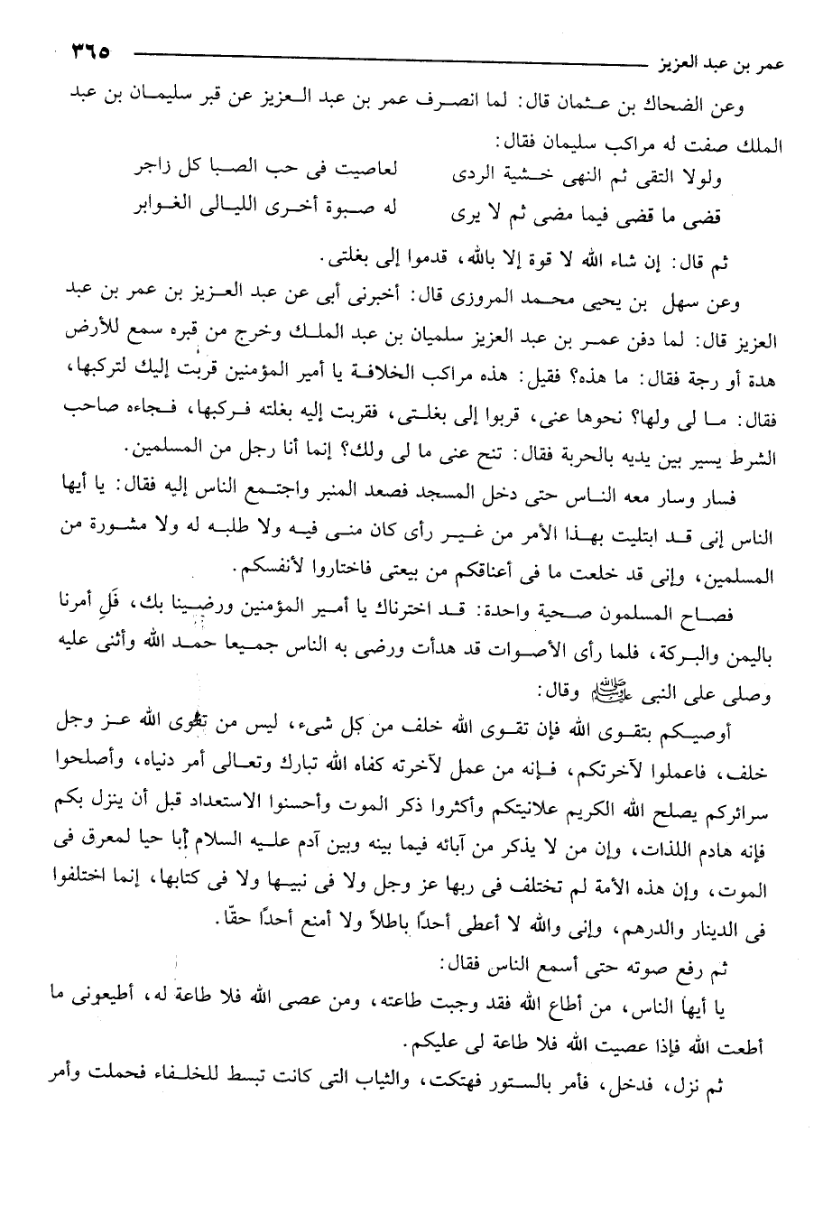 وعن سهل بن يحيى محمد المروزي قال اخبر لي أبي عن عبد العزيز بن عمر ابن عبد العزيز قال لما دفن عمر بن عبد العزيز سليمان بن عبد الملك وخرج من قبره سمع للأرض هده أو رجه فقال ما هذه فقيل هذه مراكب الخلافة يا أمير المؤمنين قربت إليك لتركبها فقال ما لي ولها نحوها عني قربوا إلي بغلتي. فقربت إليه بغلته فركبها فجاءه صاحب الشرط يسير بين يديه بالحربة فقال تنح عني ما لي ولك إنما أنا رجل من المسلمين.