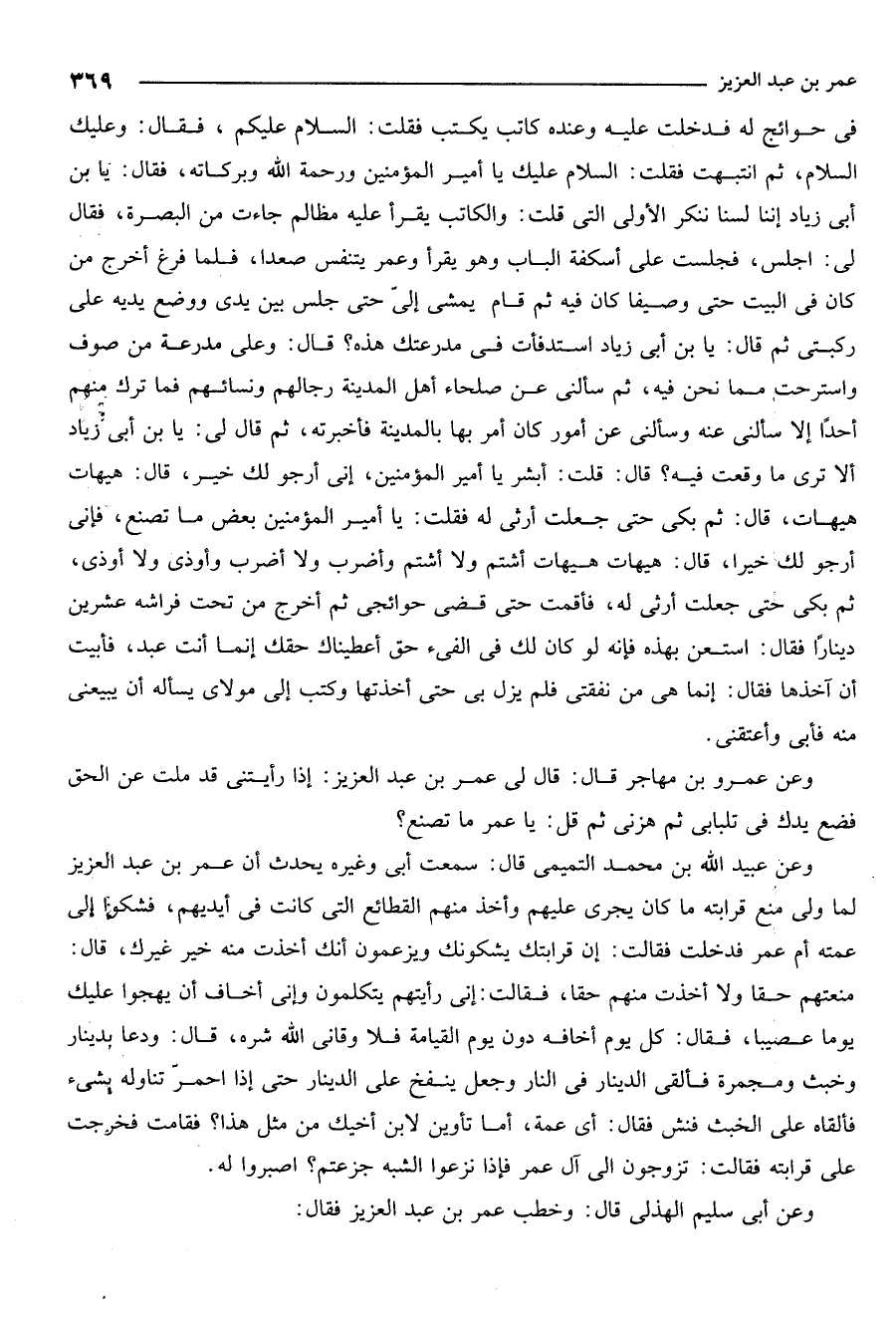 فقال وعليك السلام ثم انتبهت فقلت السلام عليك يا أمير المؤمنين ورحمة الله وبركاته فقال يا ابن أبي زياد أننا لسنا ننكر الأولى التي قلت والكاتب يقرأ عليه مظالم جاءت من البصرة فقال لي اجلس فجلست على اسكفة الباب وهو يقرأ وعمر يتنفس صعدا فلما فرغ أخرج من كان في البيت حتى وصيفا كان فيه ثم قام يمشي إلي حتى جلس بين يدي ووضع يديه على ركبتي ثم قال يا ابن أبي زياد استدفأت في مدرعتك هذه قال وعلي مدرعة من صوف واسترحت مما نحن فيه ثم سألني عن صلحاء أهل المدينة رجالهم ونسائهم فما ترك منهم أحدا إلا سألني عن أمور كان أمر بها بالمدينة فأخبرته ثم قال لي يا ابن أبي زياد إلا ترى ما وقعت فيه قال قلت ابشر يا أمير المؤمنين أني أرجو لك خيرا قال هيهات هيهات قال ثم بكى حتى جعلت ارثي له فقلت: يا أمير المؤمنين بعض ما تصنع فإني أرجو لك خيراً قال: هيهات هيهات اشتم ولا اشتم وأضرب ولا أضرب وأوذي ولا أوذي ثم بكى حتى جعلت أرثي له فأقمت حتى قضى حوائجي ثم أخرج من تحت فراشه عشرين دينارا فقال استعن بهذه فانه لو كان لك في الفيء حق أعطيناك حقك إنما أنت عبد فأبيت أن آخذها فقال إنما هي نفقتي فلم يزلبي حتى أخذتها وكتب إلي مولاي الموالي يسأله أن يبيعني منه فأبى واعتقني.