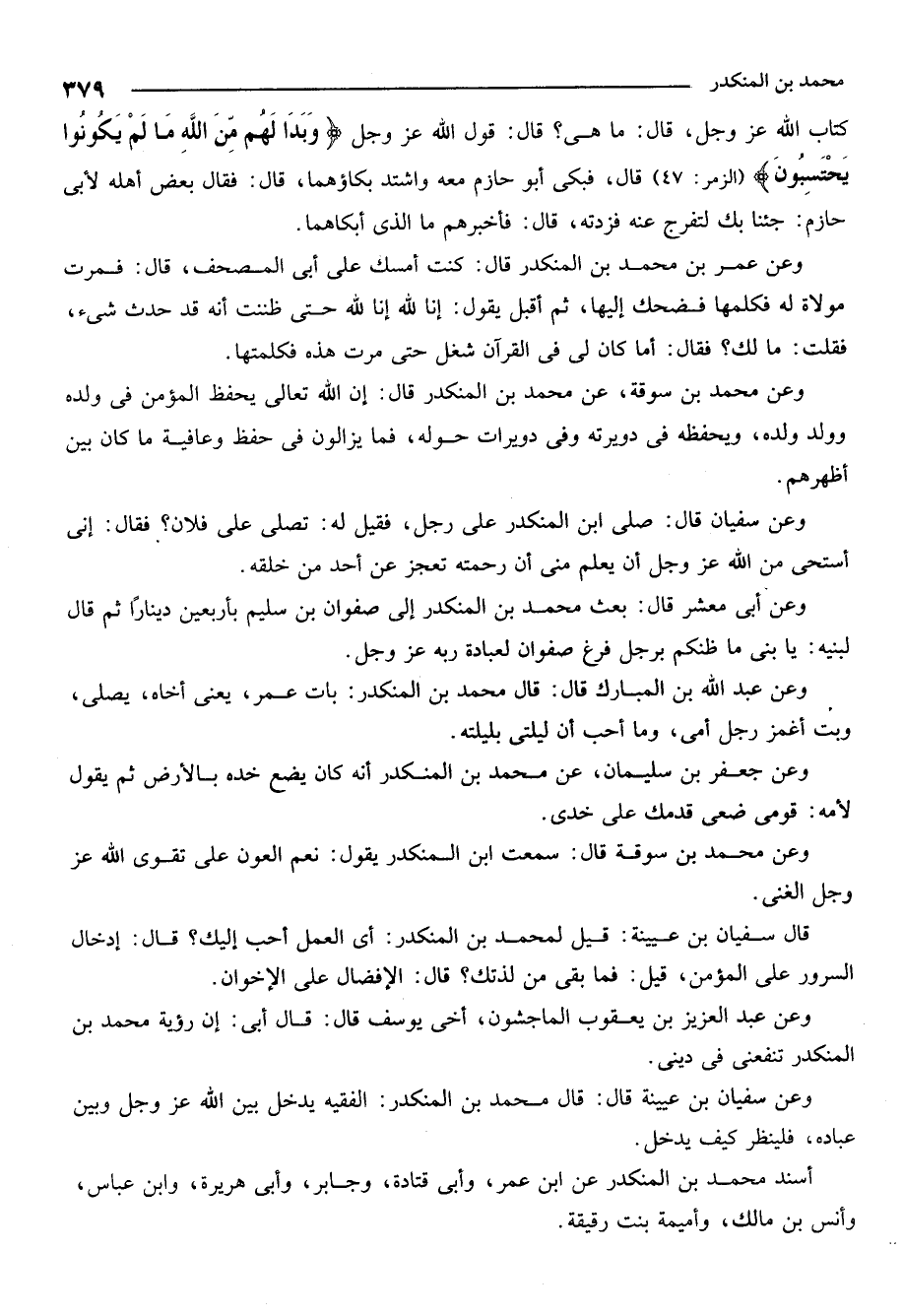وعن عمر بن محمد المنكدر قال: كنت أمسك على أبي المصحف، قال: فمّرت مولاةٌ له فكلمها فضحك إليها. ثم أقبل يقول إنّا لله إنا لله حتى ظننت أنه قد حدث شيء. فقلت: ما لك؟ فقال: أما كان لي في القرآن شُغل حتى مرّت هذه فكلمتها.