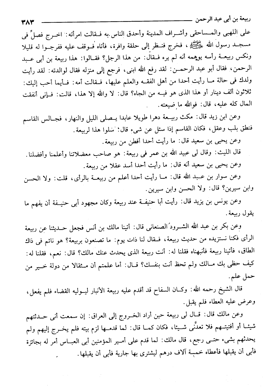 وعن سّوار بن عبد الله قال: ما رأيت أحداً أعلم من ربيعة الرأي قلت: ولا الحسن وابن سيرين؟ قال: ولا الحسن وابن سيرين.