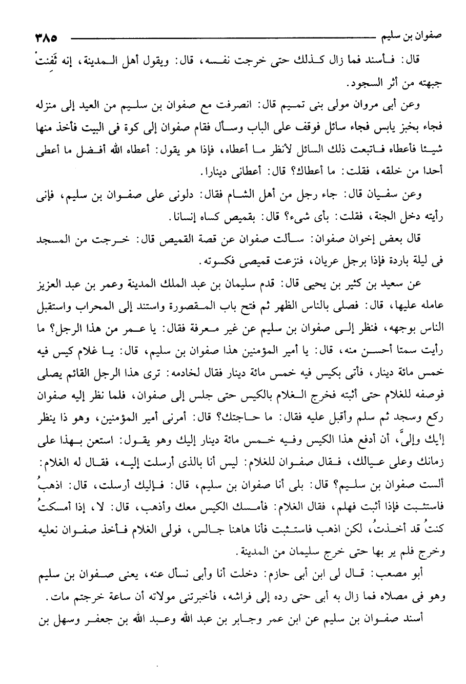 عن سعيد بن كثير بن يحيى قال: قدم سليمان بن عبد الملك المدينة وعمر بن عبد العزيز عامله عليها. قال: فصلى بالناس الظُهر ثم فتح باب المقصورة واستند إلى المحراب واستقبل الناس بوجهه، فنظر إلى صفوان بن سليم عن غير معرفة فقال: يا عمر مَن هذا الرجل، ما رأيت سَمْتاً أحسن منه؟ قال: يا أمير المؤمنين هذا صفوان بن سليم. قال: يا غلام كيس فيه خمس مائة دينار. فآتى بكيس فيه خمس مائة دينار فقال لخادمه: ترى هذا الرجل القائم يصلي فوصفه للغلام حتى أثبته فخرج الغلام بالكيس حتى جلس إلى صفوان فلما نظر إليه صفوان ركع وسجد ثم سلم واقبل عليه فقال: ما حاجتك؟ قال: امرني أمير المؤمنين، وهو ذا ينظر إليك واليّ أن ادفع هذا الكيس وفيه خمسُ مائةِ دينارٍ إليك وهو يقول: استعِنْ بهذا على زمانك وعلى عيالك. فقال صفوان للغلام: ليس أنا بالذي أرسلت إليه. فقال له الغلام: ألست صفوان بن سليم؟ قال: بلى أنا صفوان بن سليم. قال: فإليك أُرسِلت. قال: اذهب فاستثبت فإذا أثبت فهلم. فقال الغلام: فأمسك الكيس معك واذهبُ. قال: لا، إذا أمسكتُ كنتُ قد أخذتُ، ولكن اذهب فاستثبت فأنا ها هنا جالس. فولّى الغلام فأخذ صفوان نعليْه وخرج فلم يُرَ بها حتى خرج سليمان من المدينة.