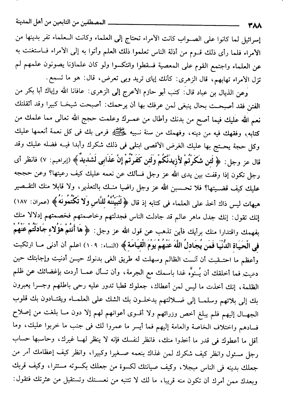 وعن الذيال بن عبّاد قال: كتب أبو حازم الأعرج إلى الزهري: عافانا الله وإياك أبا بكر من الفتن فقد أصبحت بحالٍ ينبغي لمن عرفك بها أن يرحمك: أصبحت شيخا كبيراً وقد أثقلتك نِعمُ الله عليك فيما اصحّ من بدنك وأطال من عمرك وعملت حُجَج الله تعالى مما علّمك من كتابه، وفقّهك فيه من دينه، وفهّمك من سنة نبيه صلى الله عليه وسلم فرمى بك في كلّ نعمة أنعمها عليك وكل حُجّةَ يُحَتّج بها عليك الغرض الأقصى ابتلى في ذلك شكرك وأبدا فيه فضله عليك وقد قال عز وجل: {لَئِنْ شَكَرْتُمْ لَأَزِيدَنَّكُمْ وَلَئِنْ كَفَرْتُمْ إِنَّ عَذَابِي لَشَدِيدٌ} [إبراهيم:7] فانظر أي رجل تكون إذا وقفتَ بين يدي الله عز وجل فسألك عن نِعَمه عليك كيف رعيتها، وعن حججه عليك كيف قَضيتها فلا تحسبّن الله عز وجل راضياً منك بالتعذير، ولا قابلاً منك التقصير هيهات ليس ذاك اخَذَ على العلماء في كتابه إذ قال: {لَتُبَينُّنَّه للناس ولا تكتُمونه} [آل عمران: 187] انك تقول انك جَدِلٌ ماهر عالم قد جادلت الناسَ فَجدلتهم وخاصمتَهم فخصمتهم إدلالاً منك بفَهمك واقتداراً منك برأيك فأين تذهب عن قول الله عز وجل: {هَا أَنْتُمْ هَؤُلاءِ جَادَلْتُمْ عَنْهُمْ فِي الْحَيَاةِ الدُّنْيَا فَمَنْ يُجَادِلُ اللَّهَ عَنْهُمْ يَوْمَ الْقِيَامَةِ} [النساء: 109] اعلم أن أدنى ما ارتكبت واعظم ما احتقبت أن آنستَ الظالم وسهّلت له طريق الغي بدنوك حين أُدنيت وإجابتك حين دُعيت فما أخلقك أن ينوَّه غداً باسمك مع الجَرَمة، وان تُسأل عما أردت بإغضائك عن ظُلم الظَلَّمَة، انك أخذت ما ليسَ لمن أعطاك، جعلوك قطباً تدور عليه رَحى باطِلهم وجسْراً يَعبُرون بك إلى بلائهم وسلَّمًا إلى ضلالتهم يدخلون بك الشك على العلماء ويقتادون بك قلوب الجهال إليهم، فلم يبلغ أخص وزرائهم ولا أقوى أعوانهم لهم إلا دون ما بلغت من إصلاح فسادهم واختلاف الخاصة والعامة إليهم فما ايسرَ ما عَمروا لكَ في جنْب ما خرَّبوا عليك، وما اقَّل ما أعطوك في قدْر ما اخذوا منك، فانظر لنفسك فانه لا ينظر لها غيرك، وحاسبها حسابا رجل مسؤول وانظر كيف شكرك لمن غذاك بنعمه صغيراً وكبيراً وانظر كيف إعظامُك أمر من جعلك بدينهِ في الناس مبجلا، وكيْف صيانتُك لكسْوةِ من جعلك بكسوته مستترا، وكيف قربك وبُعدك ممن أمرك أن تكون منه قريباً، ما لك لا تتنبه من نعستك. وتستقيل من عثرتك فتقول: