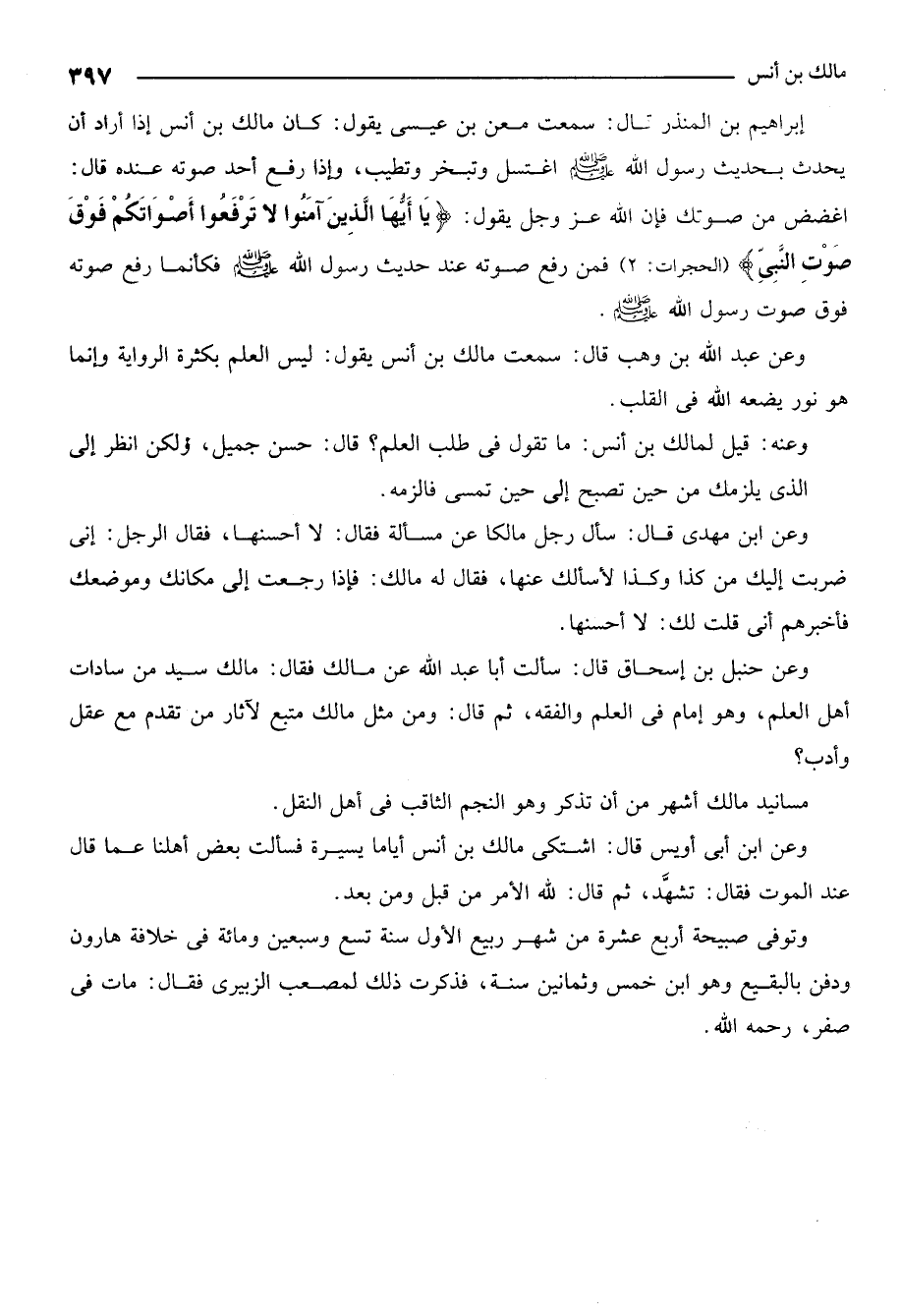 قال إبراهيم بن المنذر: سمعت معن ابن عيسى يقول: كان مالك بن انس إذا أراد أن يحدث بحديث رسول الله صلى الله عليه وسلم اغتسل وتبخر وتطيب، وإذا رفع أحد صوته عنده قال: اغضض من صوتك فإن الله عز وجل يقول: {يَا أَيُّهَا الَّذِينَ آمَنُوا لا تَرْفَعُوا أَصْوَاتَكُمْ فَوْقَ صَوْتِ النَّبِيِّ} [الحجرات: 2] فمن رفع صوته عند حديث رسول الله صلى الله عليه وسلم فكأنما رفع صوته فوق صوت رسول الله صلى الله عليه وسلم.