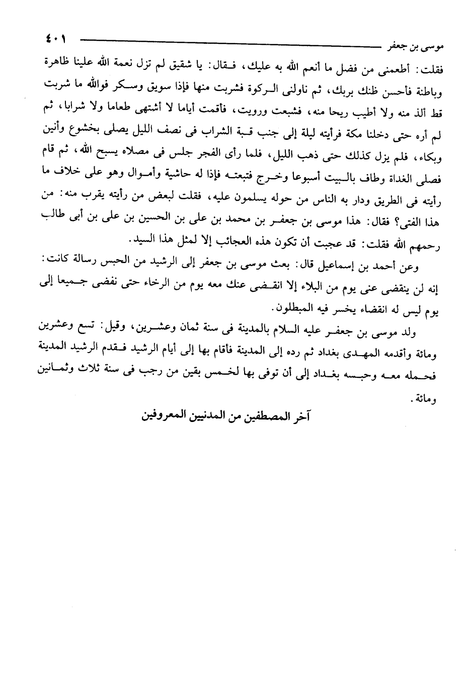 فقلت أطعمني من فضل ما أنعم الله به عليك. فقال يا شقيق لم تزل نعمة الله علينا ظاهرة وباطنة فأحسن ظنك بربك ثم ناولني الركوة فشربت منها فإذا سويق وسكر فوالله ما شربت قط ألذ منه ولا أطيب ريحا منه فشبعت ورويت فاقمت أياما لا اشتهي طعاما ولا شرابا ثم لم أره حتى دخلنا مكة فرايته ليلة إلى جنب قبة الشراب في نصف الليل يصلي بخشوع وانين وبكاء فلم يزل كذلك حتى ذهب الليل فلما رأى الفجر جلس في مصلاه يسبح الله ثم قام فصلى الغداة وطاف بالبيت أسبوعا وخرج فتبعته فإذا له حاشية وموال وهو على خلاف ما رايته في الطريق ودار به الناس من حوله يسلمون عليه فقلت لبعض من رايته يقرب منه من هذا الفتى فقال هذا موسى بن جعفر بن محمد بن علي بن الحسين بن علي بن أبي طالب عليهم السلام فقلت قد عجبت أن تكون هذه العجائب إلا لمثل هذا السيد.