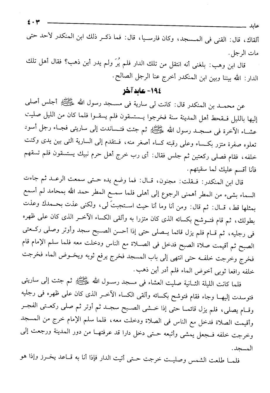 عن محمد بن المنكدر قال كانت لي سارية في مسجد رسول الله صلى الله عليه وسلم اجلس اصلي إليها بالليل فقحط أهل المدينة سنة فخرجوا يستقون فلم يسقوا فلما كان من الليل صليت عشاء الآخرة في مسجد رسول الله صلى الله عليه وسلم ثم جئت فتساندت إلى ساريتي فجاء رجل اسود تعلوه صفرة متزر بكساء وعلى رقبته كساء اصغر منه. أي رب خرج أهل حرم نبيك يستسقون فلم تسقهم فأنا اقسم عليك لما سقيتهم.