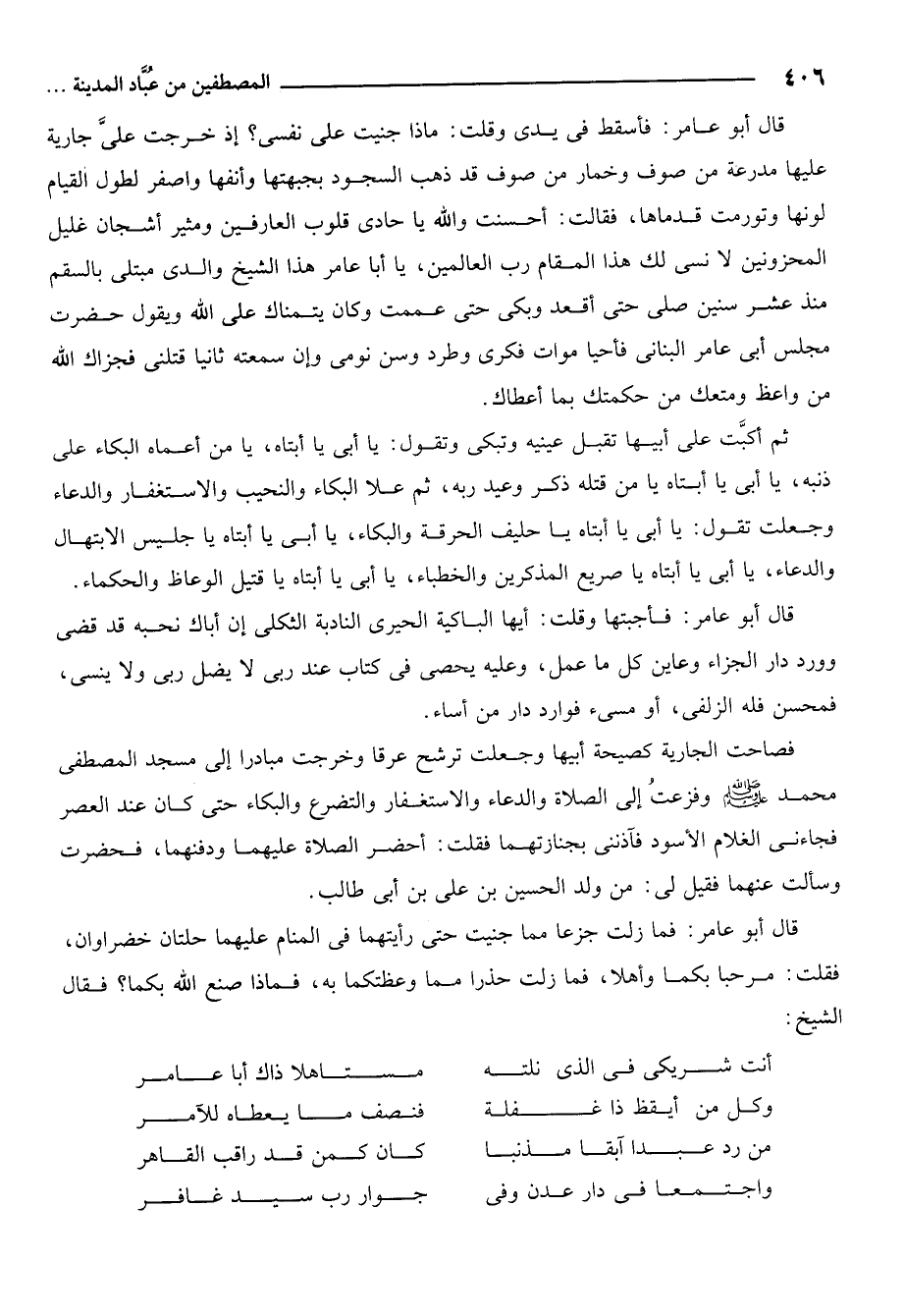 قال أبو عامر فأجبتها وقلت أيها الباكية الحيرى النادبة الثكلى إن أباك نحبه قد قضى وورد دار الجزاء وعاين كل ما عمل وعليه يحصى في كتاب عند ربي لا يضل ربي ولا ينسى فمحسن فله الزلفى أو مسيء فوارد دار من أساء.