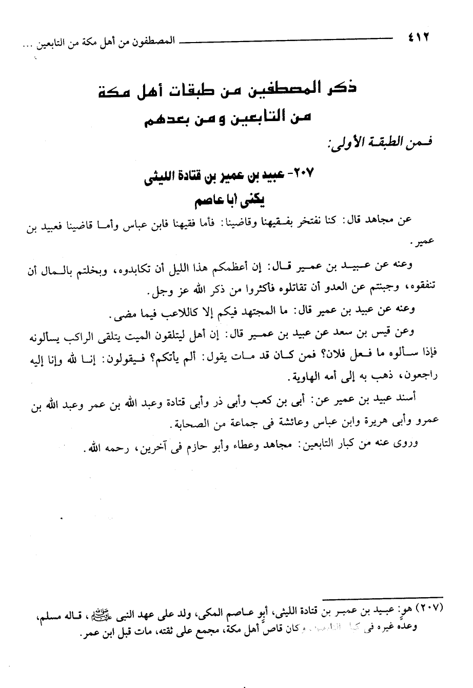 207- هو: عبيد بن عمير بن قتادة الليثي أبو عاصم المكي ولد على عهد النبي صلى الله عليه وسلم قاله مسلم وعده غيره في كبار التابعين وكان قاص أهل مكة مجمع على ثقته مات قبل ابن عمر.