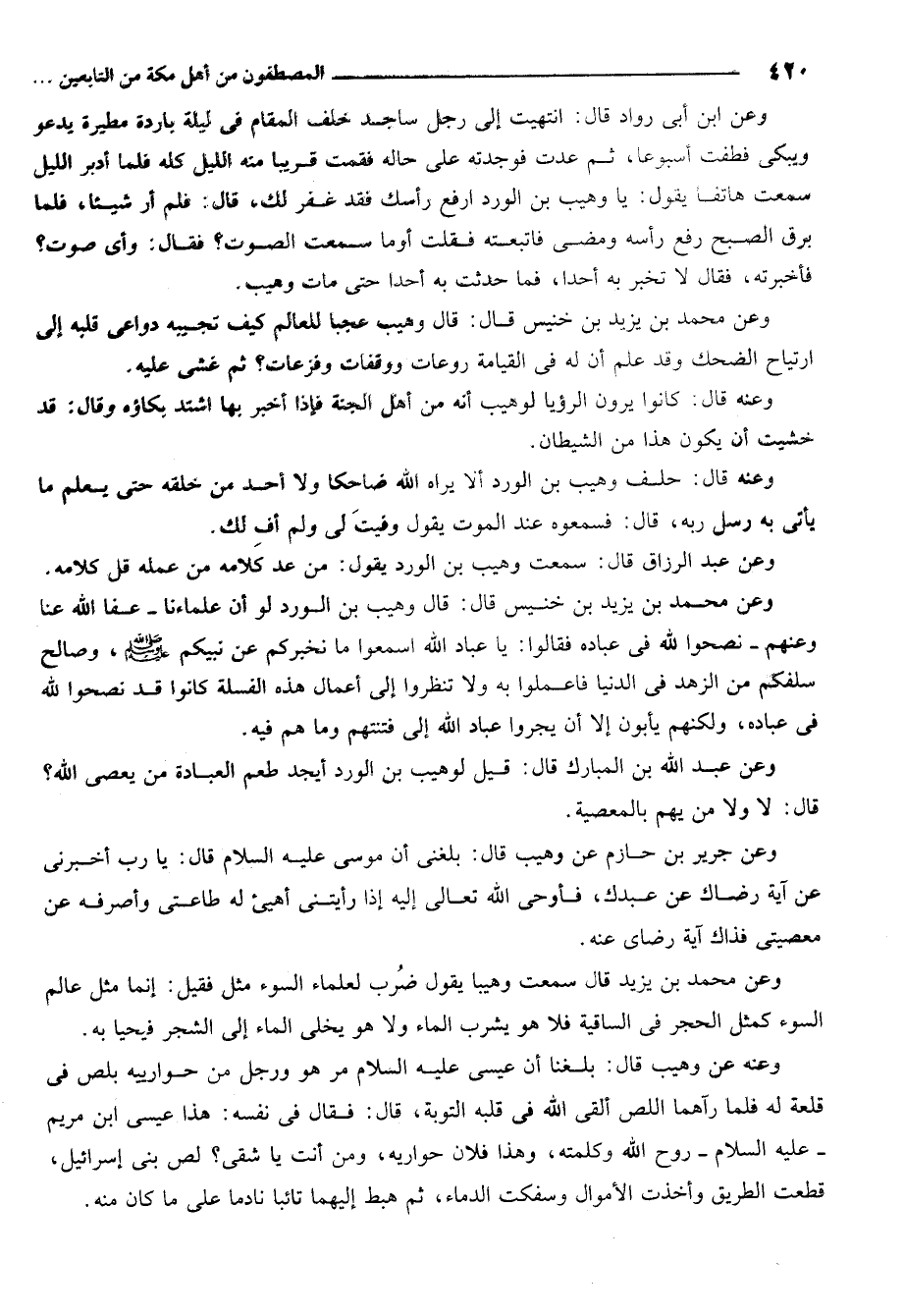 وعن محمد بن يزيد قال سمعت وهيباً يقول ضرب لعلماء السوء مثل فقيل إنما مثل عالم السوء كمثل الحجر في الساقية فلا هو يشرب الماء ولا هو يخلي الماء إلى الشجر فيحيا به. وعنه عن وهيب قال بلغنا أن عيسى عليه السلام مر هو ورجل من حوارييّه بلص في قلعة له فلما رآهما اللص ألقى الله في قلبه التوبة قال فقال في نفسه هذا عيسى ابن مريم عليه السلام روح الله وكلمته وهذا فلان حواريه ومن أنت يا شقي لص بني إسرائيل قطعت الطريق وأخذت الأموال وسفكت الدماء ثم هبط إليهما تائبا نادما على ما كان منه.