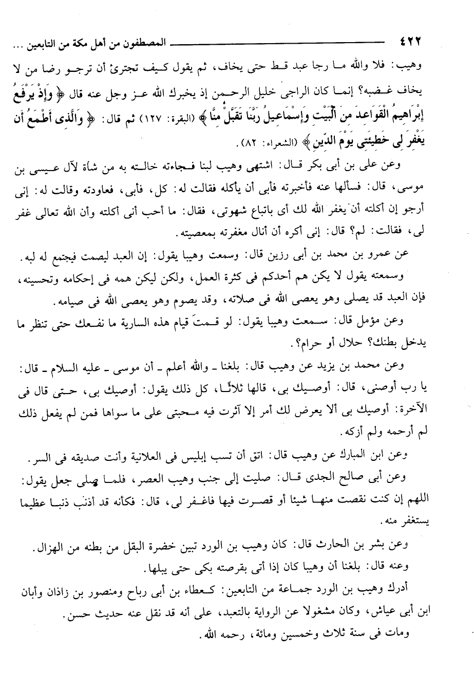 وعن علي بن أبي بكر قال اشتهي وهيب لبنا فجاءته خالته به من شاة لآل عيسى بن موسى قال فسألها عنه فأخبرته فأبى أن يأكله فقالت له كل فأبى فعاودته وقالت له: إني أرجو إن أكلته أن يغفر الله لك أي باتباع شهوتي فقال: ما أحب أنى أكلته وإن الله تعالى غفر لي فقالت لمقال إني أكره أن أنال مغفرته بمعصيته.