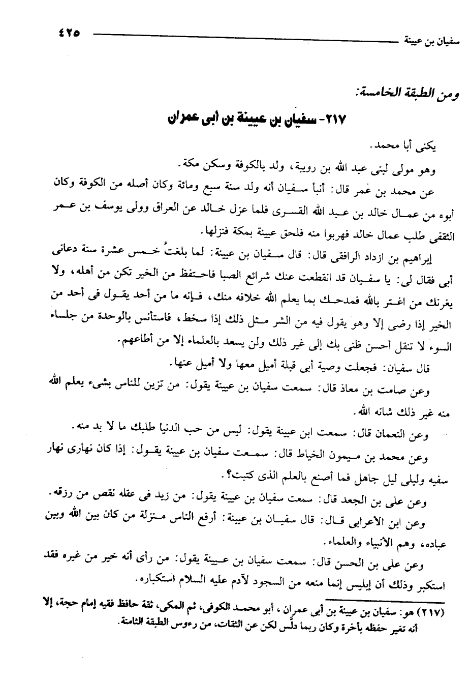 217- هو: سفيان بن عيينة بن أبي عمران أبو محمد الكوفي ثم المكي ثقة حافظ فقيه إمام حجة إلا أنه تغير حفظه بأخرة وكان ربما دلس لكن عن الثقات من رؤس الطبقة الثامنة.