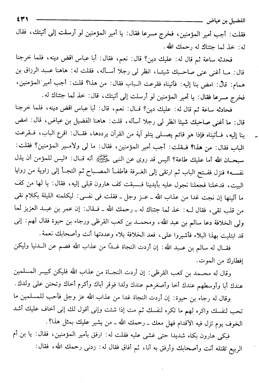 فحادثه ساعة ثم قال له عليك دين قال نعم قال أبا عباس اقض دينه. فلما خرجنا قال ما أغنى صاحبك شيئا انظر لي رجلا اسأله قلت ها هنا الفضيل ابن عياض قال امض بنا إليه فأتيناه فإذا وهو قائم يصلي يتلو آية من القرآن يرددها فقال اقرع الباب فقرعت الباب فقال من هذا فقلت أجب أمير المؤمنين فقال ما لي ولأمير المؤمنين فقلت سبحان الله أما عليك طاعة؟ أليس قد روي عن النبي صلى الله عليه وسلم انه قال: "ليس للمؤمن أن يُذل نفسه" فنزل ففتح الباب ثم إرتقى إلى الغرفة فأطفا المصباح ثم إلتجأ إلى زواية من زوايا البيت فدخلنا فجعلنا نجول عليه بأيدينا فسبقت كف هارون قبلي إليه فقال يا لها من كف ما ألينها إن نجت غدا من عذاب الله عز وجل فقلت في نفسي ليكلمنه الليلة بكلام نقي من قلب تقي فقال له خذ لما جئناك له رحمك الله فقال إن عمر بن عبد العزيز لما ولى الخلافة دعا سألم بن عبد الله ومحمد بن كعب القرظي ورجاء ابن حيوة فقال لهم إني قد ابتليت بهذا البلاء فأشيروا عليَّ. فعدَّ الخلافة بلاء وعددتها أنت وأصحابك نعمة.