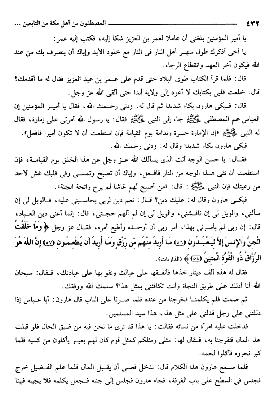 قال فبكى هارون بكاء شديدا ثم قال له زدني رحمك الله فقال يا أمير المؤمنين إن العباس عم المصطفى صلى الله عليه وسلم جاء إلى النبي صلى الله عليه وسلم فقال يا رسول الله أمّرني على إمارة فقال له النبي صلى الله عليه وسلم "إن الإمارة حسرة وندامة يوم القيامة فإن استطعت أن لا تكون أميرا فافعل".