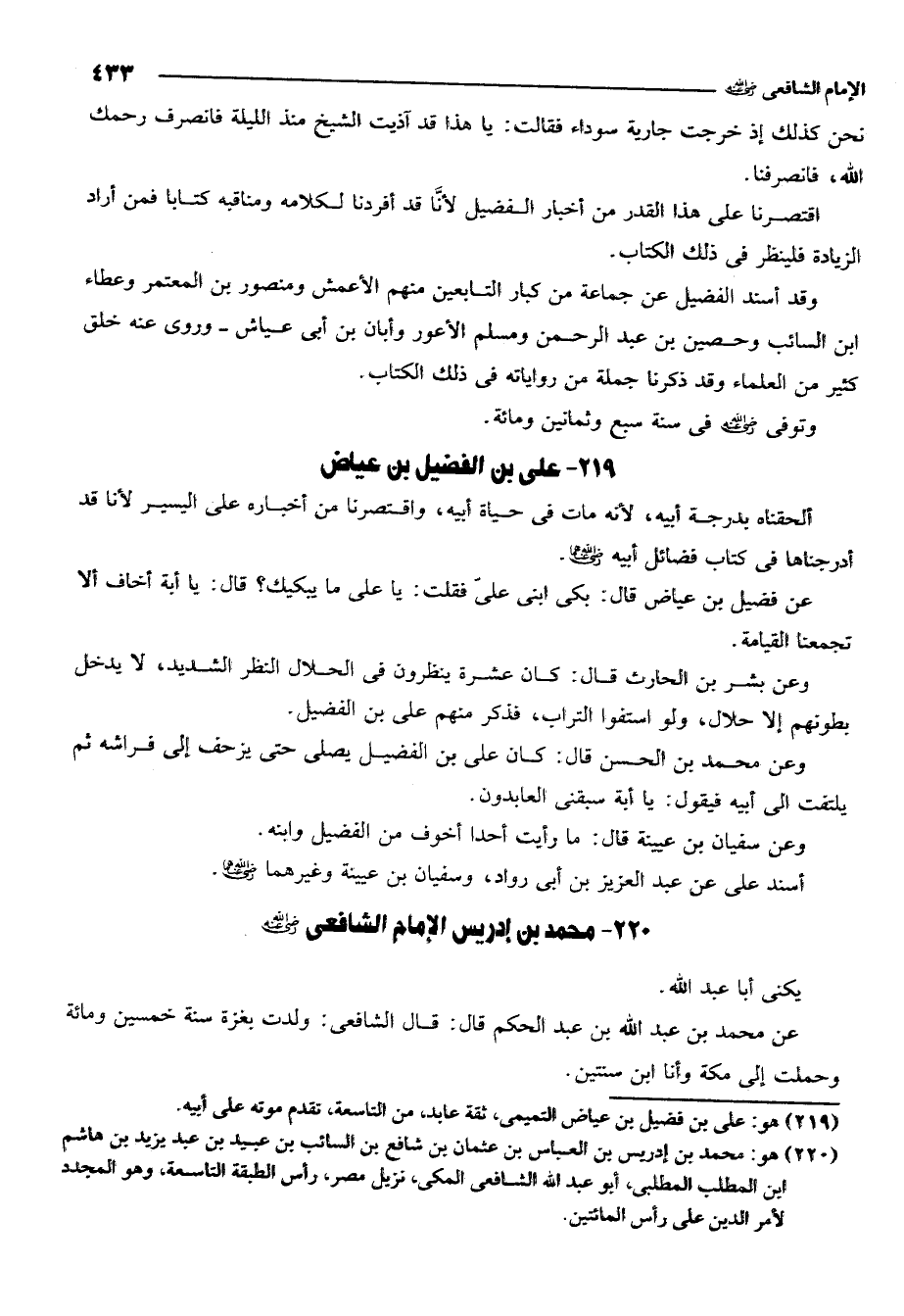 220- هو: محمد بن إدريس بن العباس بن عثمان بن شافع بن السائب بن عبيد بن عبد يزيد بن هاشم ابن المطلب المطلبي أبو عبد الله الشافعي المكي نزيل مصر رأس الطبقة التاسعة وهو المجدد لأمر الدين على رأس المائتين.