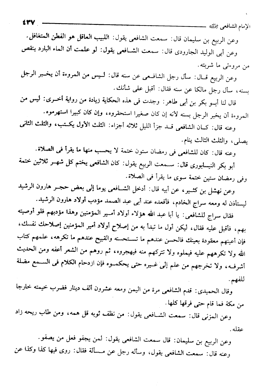 وعن الربيع بن سليمان قال سمعت الشافعي يقول اللبيب العاقل هو الفطن المتغافل. وعن ابي الوليد الجارودي قال سمعت الشافعي يقول لو علمت ان الماء البارد ينقص من مروءتي ما شربته.
