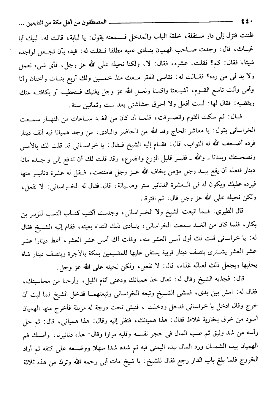 قال الطبري فما اتبعت الشيخ ولاالخراساني وجلست اكتب كتاب النسب للزبير بن بكار فلما كان من الغد سمعت الخراساني ينادي ذلك النداء بعينه فقام إليه الشيخ فقال له يا خراساني قلت لك اول امس العشر منه وقلت لك امس عشر العشر اعط دينار عشر عشر العشر يشتري بنصف دينار قريبة يستفي عليها للمقيمين بمكة بالاجرة وبنصف دينار شاة يحلبها ويجعل ذلك لعياله غذاء قال لا نفعل ولكن نحيله على الله عز وجل.