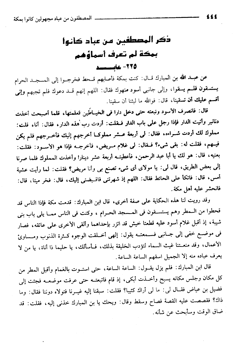 عن عبد الله بن المبارك قال كنت بمكة فاصابهم قحط فخرجوا الى المسجد الحرام يستسقون فلم يسقوا والى جانبي اسود منهوك فقال اللهم انهم قد دعوك فلم تجبهم واني اقسم عليك ان تسقينا قال فوالله ما لبثنا ان سقينا.