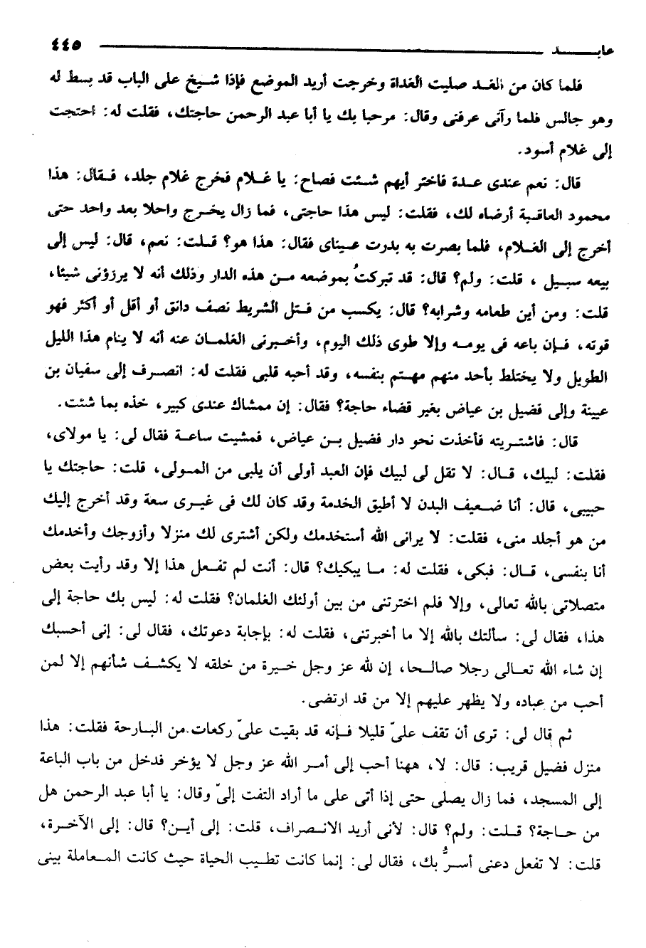 ثم قال لي ترى ان تقف علي قليلا فانه قد بقيت علي ركعات من البارحة فقلت هذا منزل فضيل قريب قال لا ههنا احب الى امر الله عز وجل لا يؤخر فدخل من باب الباعة الى المسجد فما زال يصلي حتى اذا اتى على ما اراد التفت الي وقال يا ابا عبد الرحمن هل من حاجة قلت ولم قال لاني اريد الانصراف قلت الى اين قال الى الاخرة قلت لا تفعل دعني اسر بك. فقال لي انما كانت تطيب الحياة حيث كانت المعاملة بيني