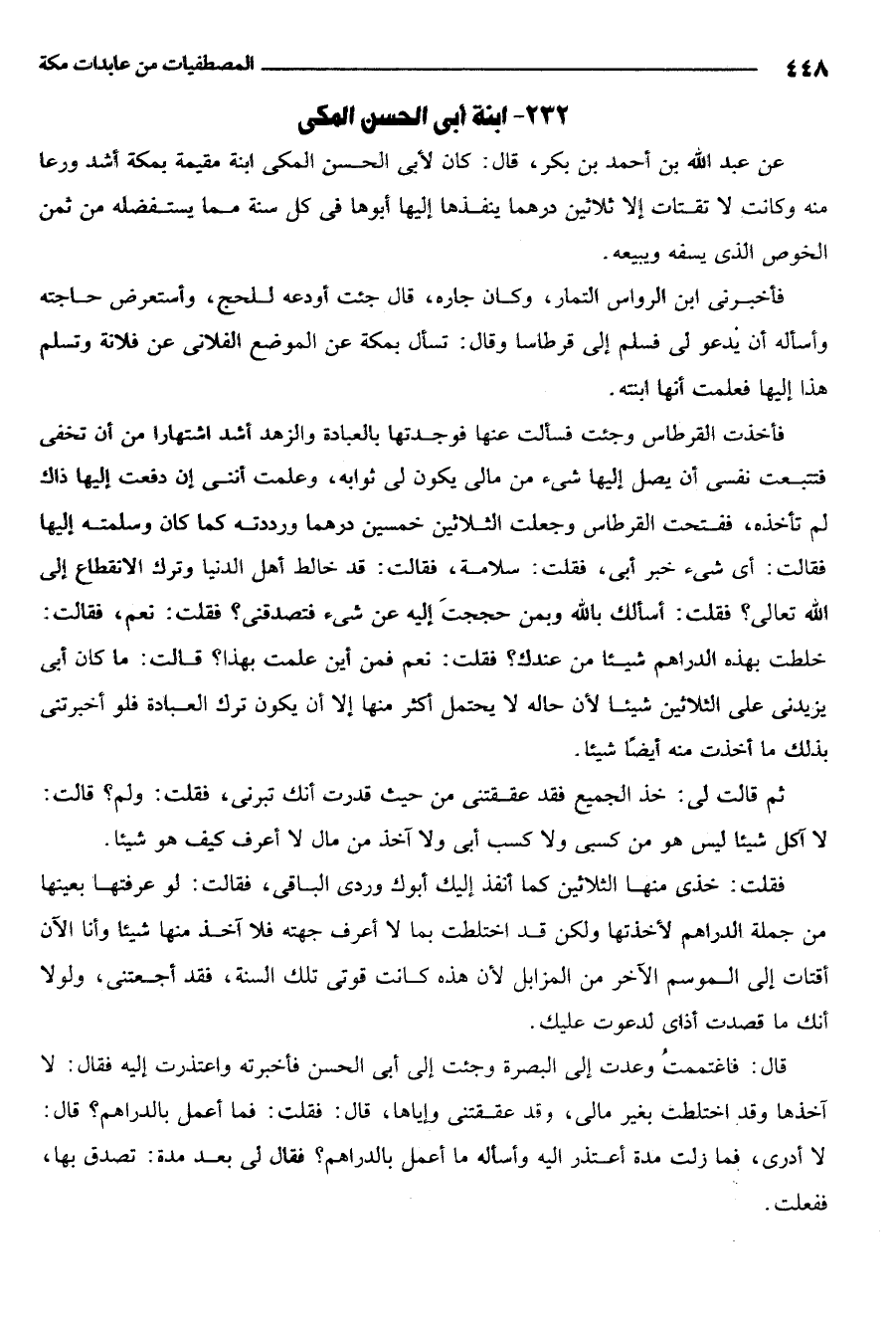 فاخذت القرطاس وجئت فسالت عنها فوجدتها بالعبادة والزهد اشد اشتهارا من ان تخفى فتتبعت نفسي ان تصل اليها شيء من مالي يكون لي ثوابه وعلمن انني ان دفعت اليها ذاك لم تأخذه ففتحت القرطاس وجعلت الثلاثين خمسين درهما ورددته كما كان وسلمته اليها فقالت أي شيء خبر أبي فقلت سلامة فقالت قد خالط أهل الدنيا وترك الانقطاع الى الله تعالى فقلت أسألك بالله وبمن حججت إليه عن شيء فتصدقني فقلت نعم فقالت خلطت بهذه الدراهم شيئاً من عندك فقلت نعم فمن اين علمت بهذا قالت ما كان ابي يزيدني على الثلاثين شيئاً لان حاله لا يحتمل أكثر منها إلا أن تكون ترك العادة فلو أخبرتني بذلك ما أخذت منه أيضاً شيئاً.
