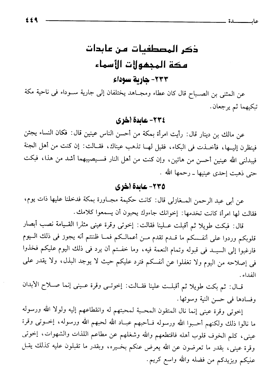 عن مالك بن دينار قال رأيت امرأة بمكة من أحسن الناس عينين قال فكان النساء يجئن فينظرن اليها فاخذت في البكاء فقيل لها تذهب عيناك فقالت ان كنت من اهل الجنة فيبدلني الله عينين احسن من هاتين وان كنت من اهل النار فسيصيبهما اشد من هذا فبكت حتى ذهبت إحدى عينيها رحمها الله.