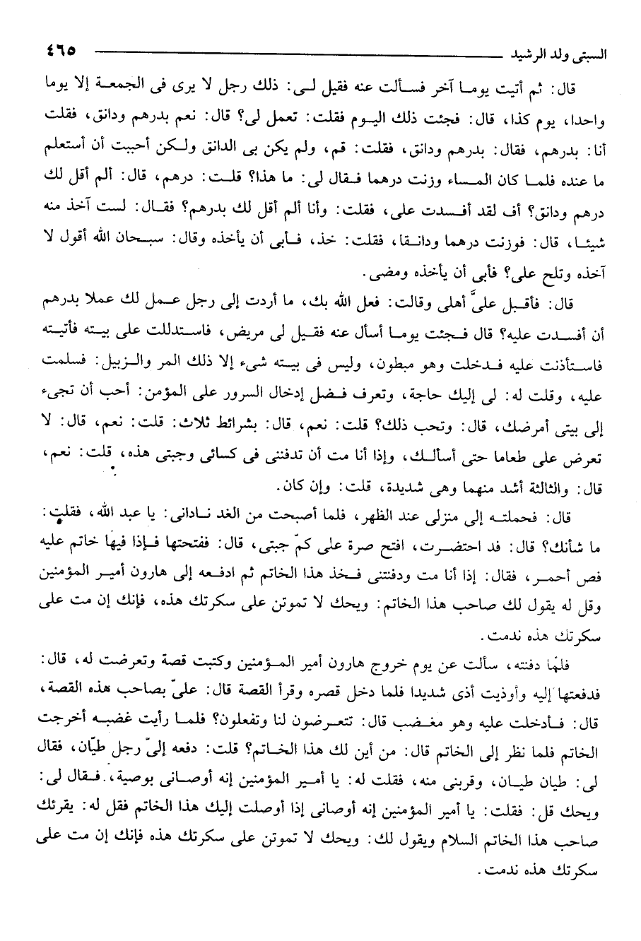 فلما دفنته سألت عن يوم خروج هارون أمير المؤمنين وكتبت قصة وتعرضت له قال فدفعتها إليه واوذيت اذى شديدا فلما دخل قصره وقرا القصة قال علي بصاحب هذه القصة قال فادخلت عليه وهو مغضب قال تتعرضون لنا وتفعلون فلما رأيت غضبه أخرجت الخاتم فلما نظر إلى الخاتم قال: من أين لك هذا الخاتم قلت: دفعه إلى رجل طيان فقال لي طيان طيان وقربني منه. فقلت له يا أمير المؤمنين انه أوصاني بوصية فقال لي ويحك قل فقلت يا أمير المؤمنين انه أوصاني إذا أوصلت اليك هذا الخاتم فقل له يقرئك صاحب هذا الخاتم السلام ويقول لك ويحك لا تموتن على سكرتك هذه فانك ان مت على سكرتك هذه ندمت.