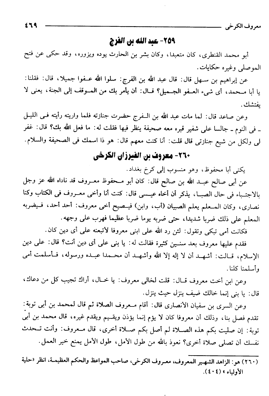 260- هو: الزاهد الشهير المعروف معروف الكرخي صاحب المواعظ والحكم العظيمة أنظر حلية الأولياء 404.