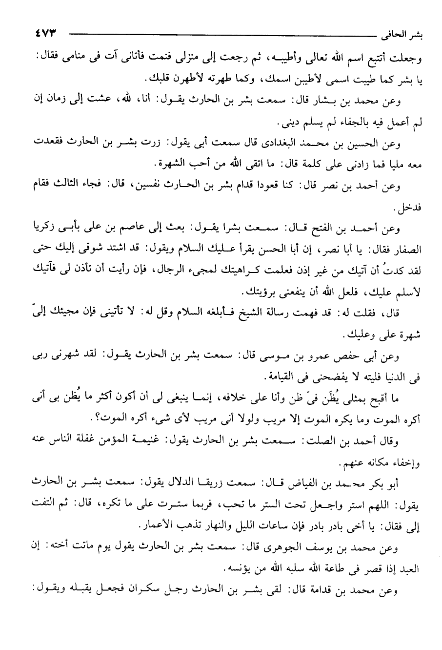 وعن محمد بن بشار قال سمعت بشر بن الحارث يقول أنا لله عشت إلى زمان ان لم اعمل فيه بالجفاء لم يسلم ديني.