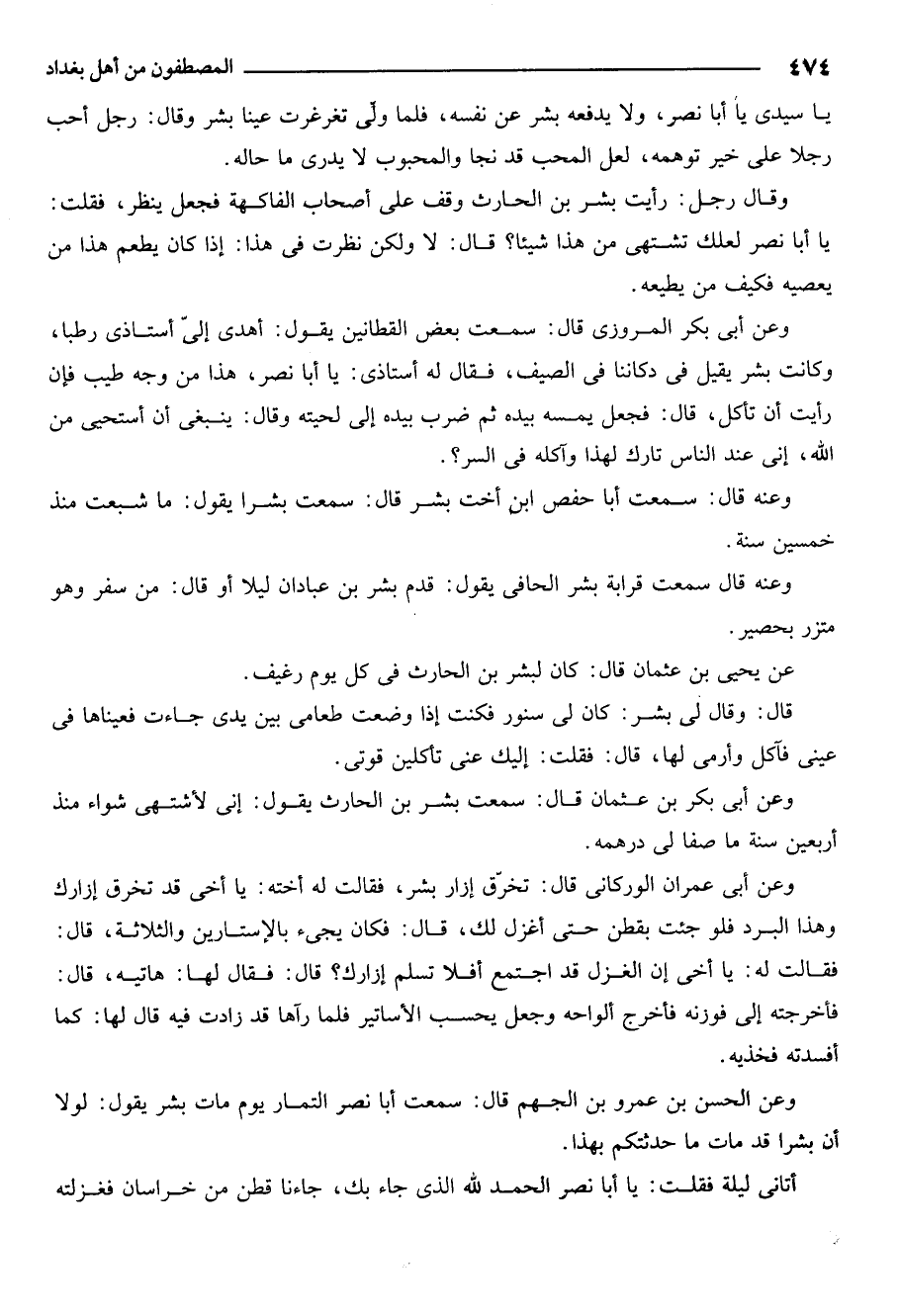 يا سيدي يا أبا نصر ولا يدفعه بشر عن نفسه فلما ولى تغرغرت عينا بشر وقال رجل أحب رجلا على خير توهمه لعل المحب قد نجا والمحبوب لا يدري ما حاله.