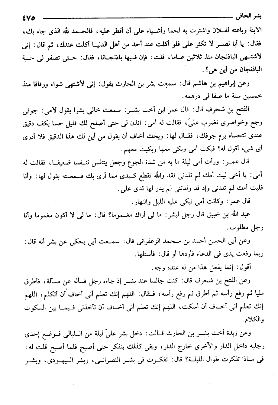 الفتح بن شحرف قال قال عمر ابن أخت بشر سمعت خالي بشرا يقول لأمي جوفي وجع وخواصري تضرب علي فقالت له أمي ائذن لي حتى أصلح لك قليل حسا بكف دقيق عندي تتحساه يرم جوفك فقال لها ويحك أخاف ان يقول من أين لك هذا الدقيق فلا ادري أي شيء اقول له فبكت أمي وبكى معها وبكيت معهم.
